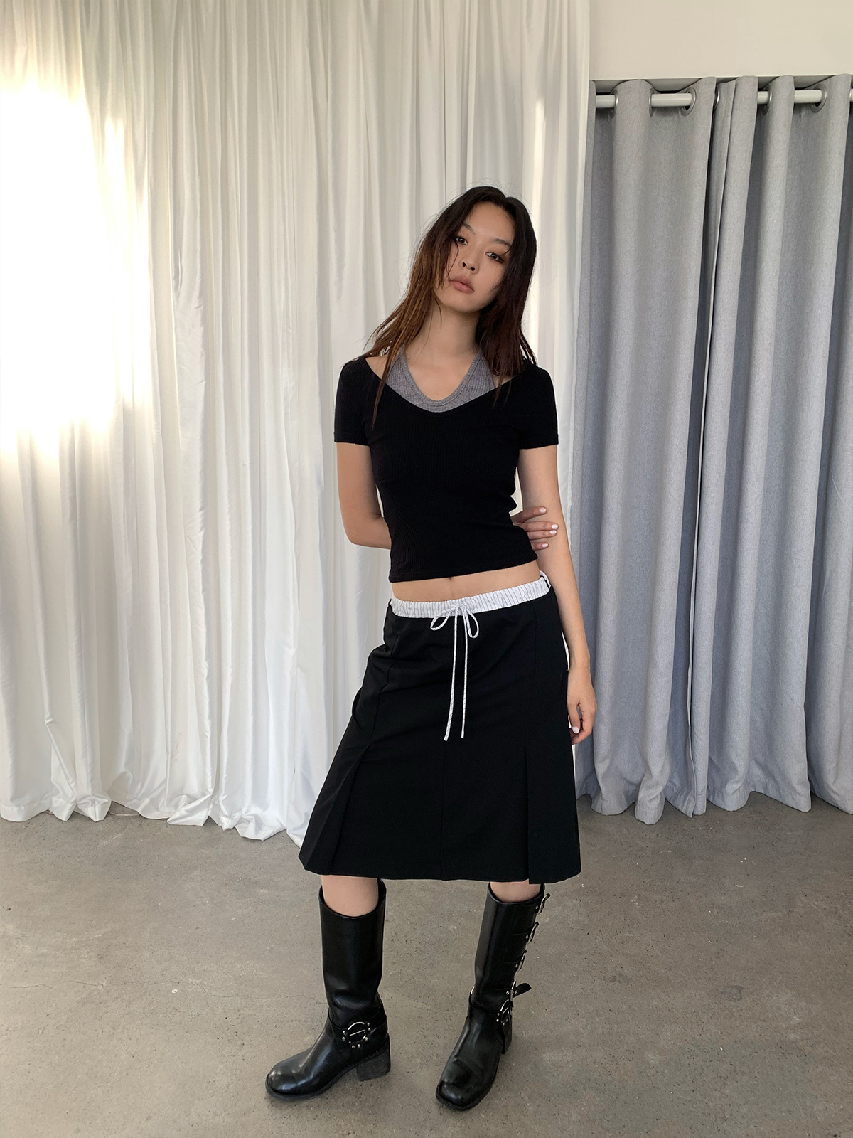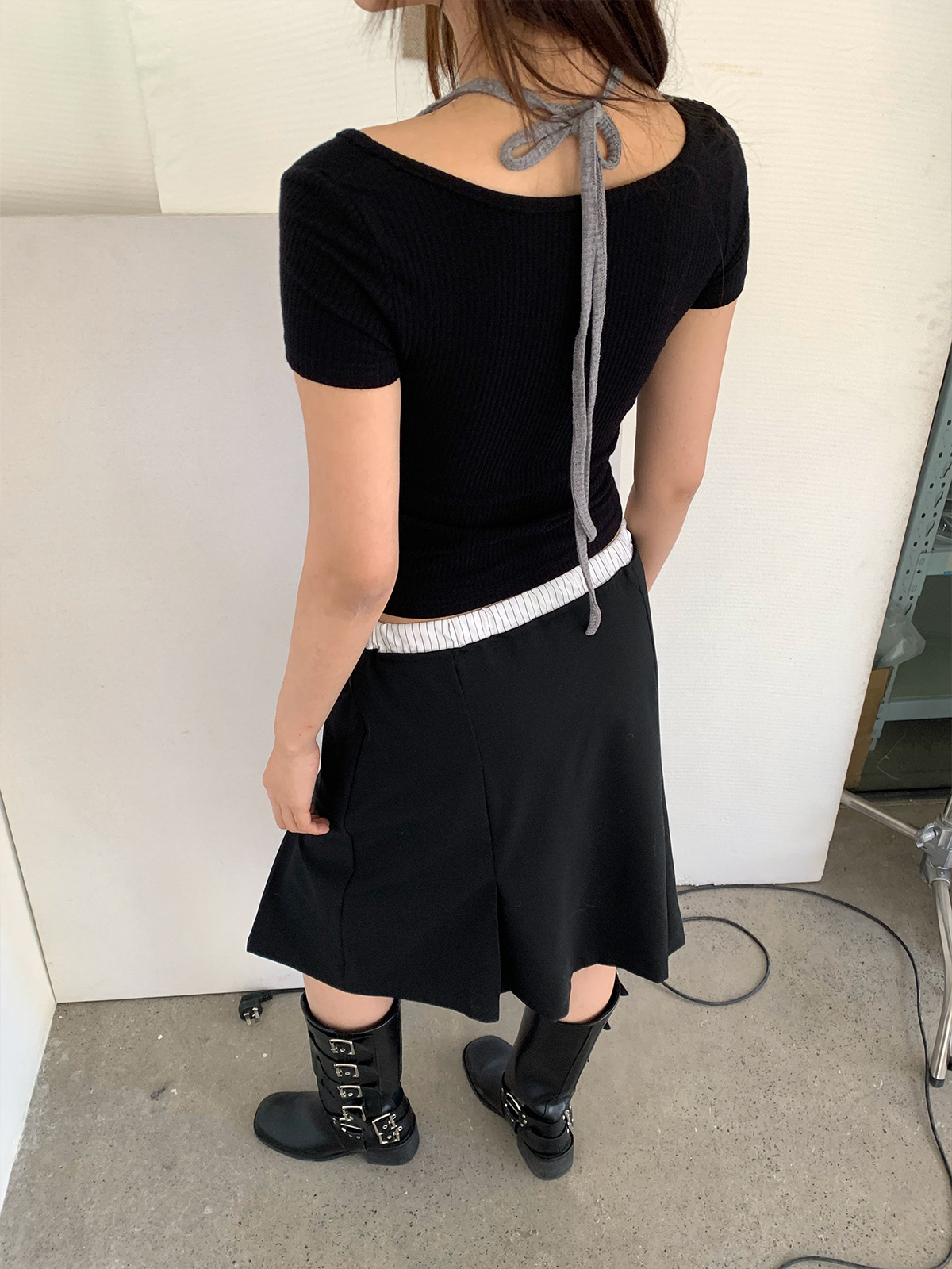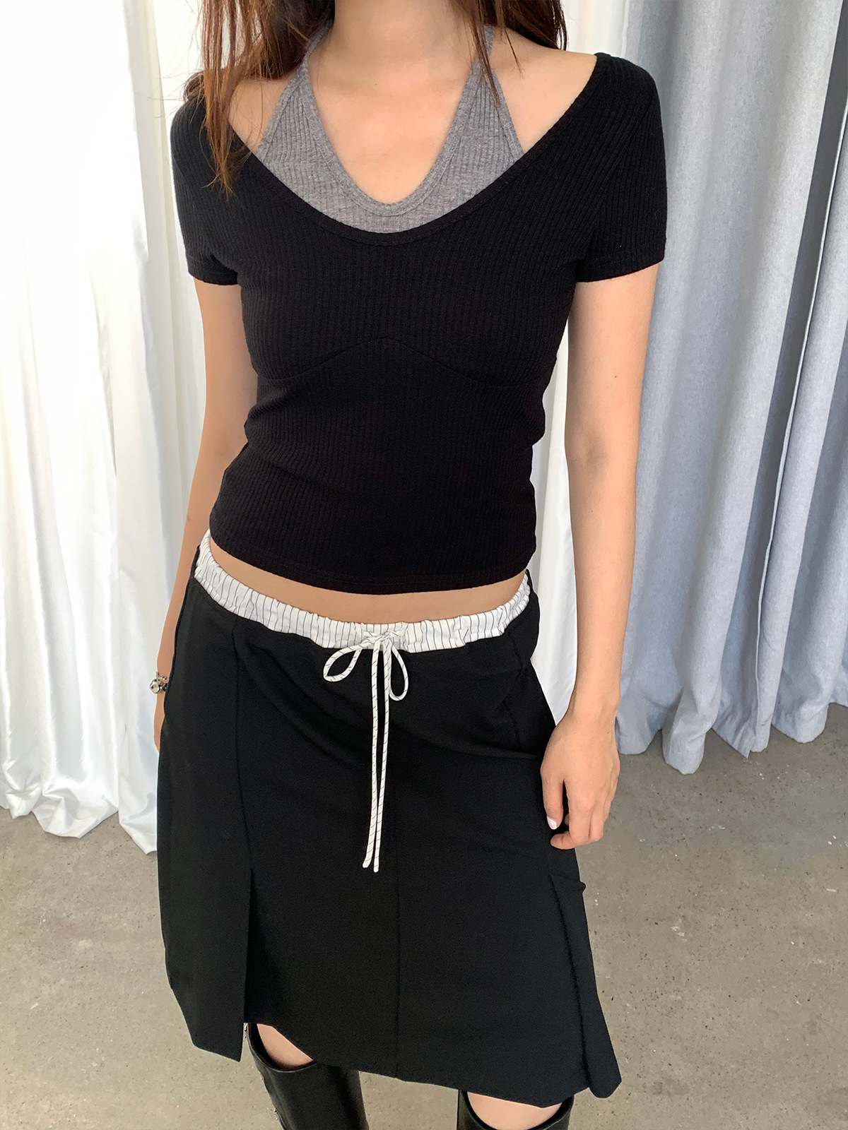 夏季新品假两件设计感辣妹短袖T恤修身坑条撞色上衣女