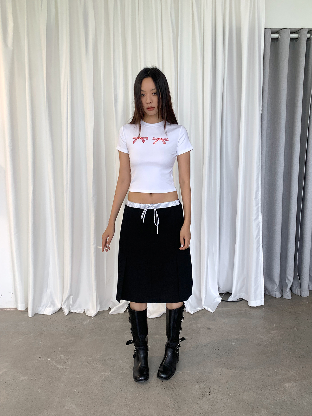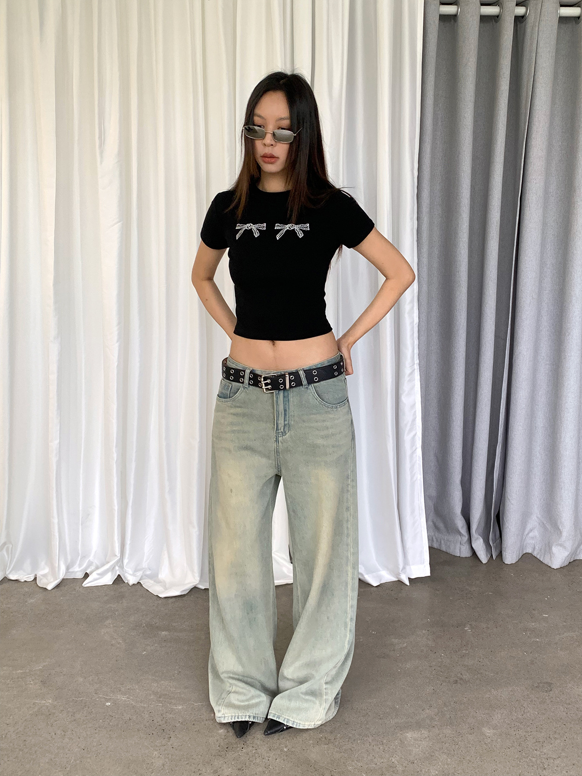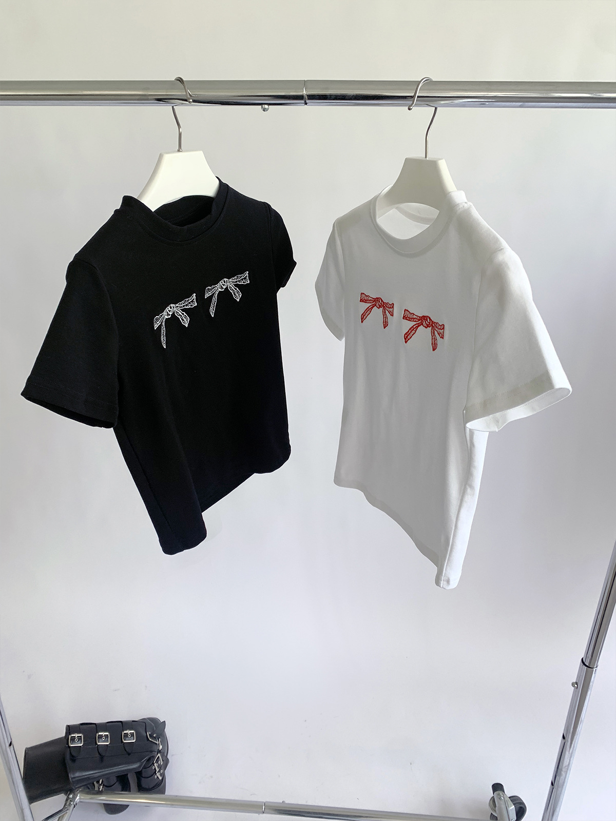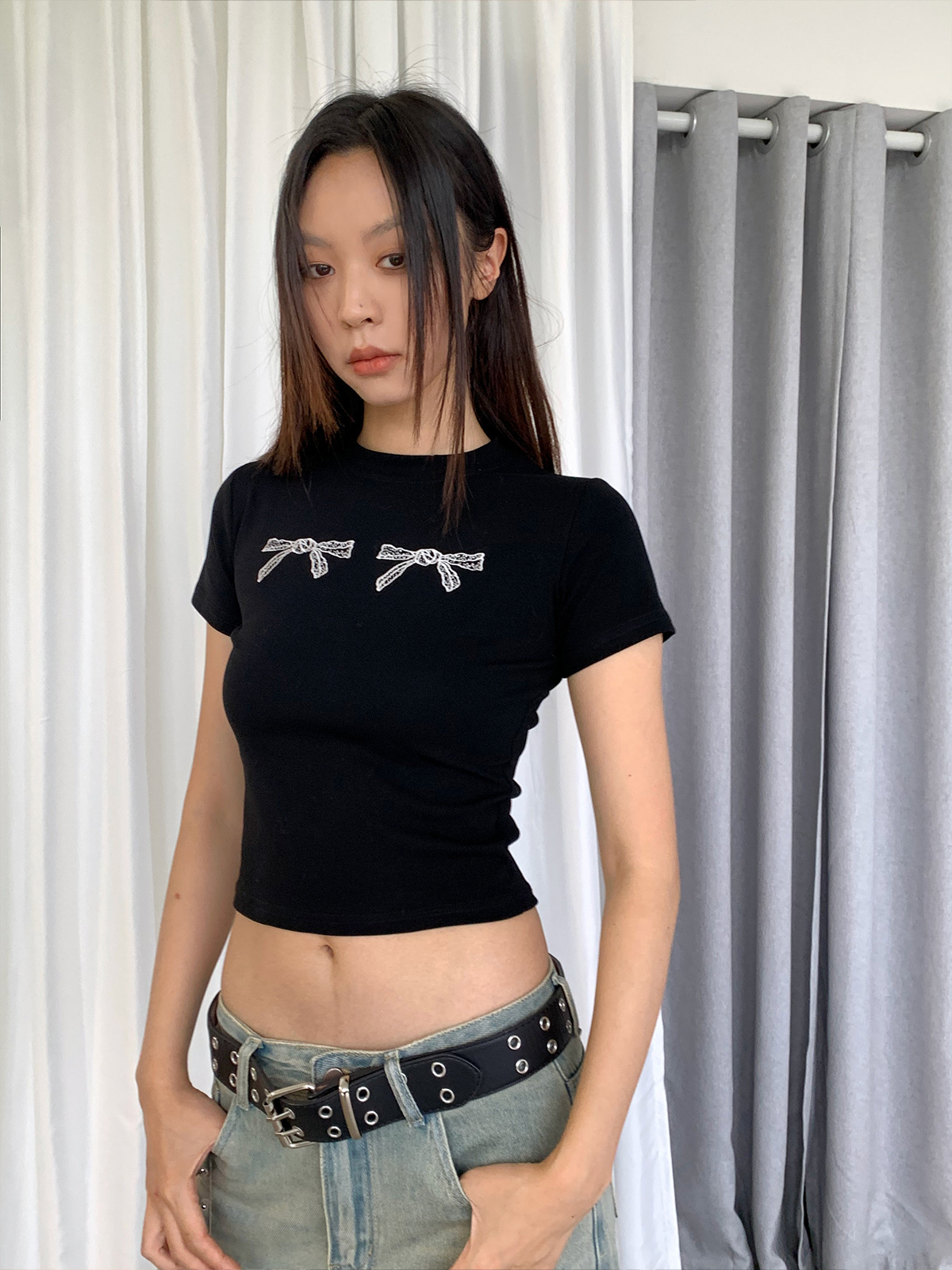 夏季时新品甜妹蝴蝶结印花短袖T恤辣妹短款正肩上衣女