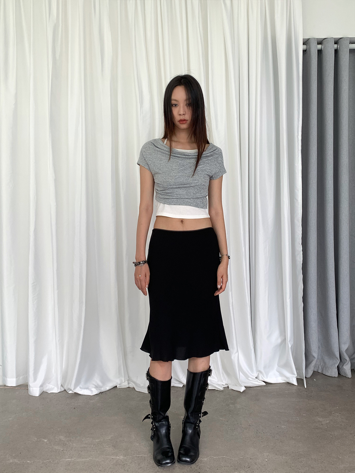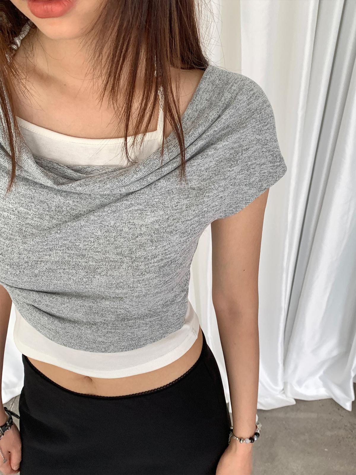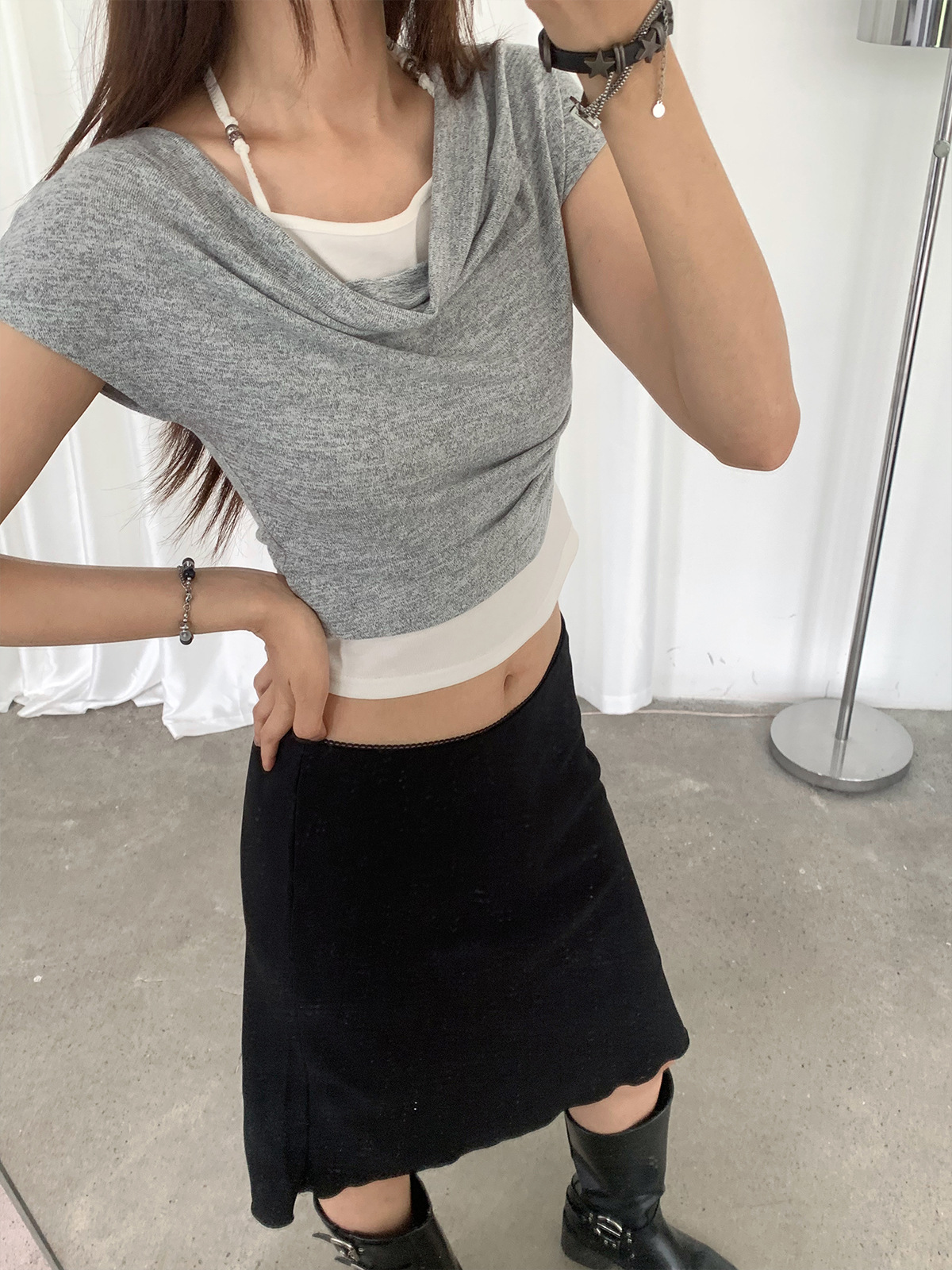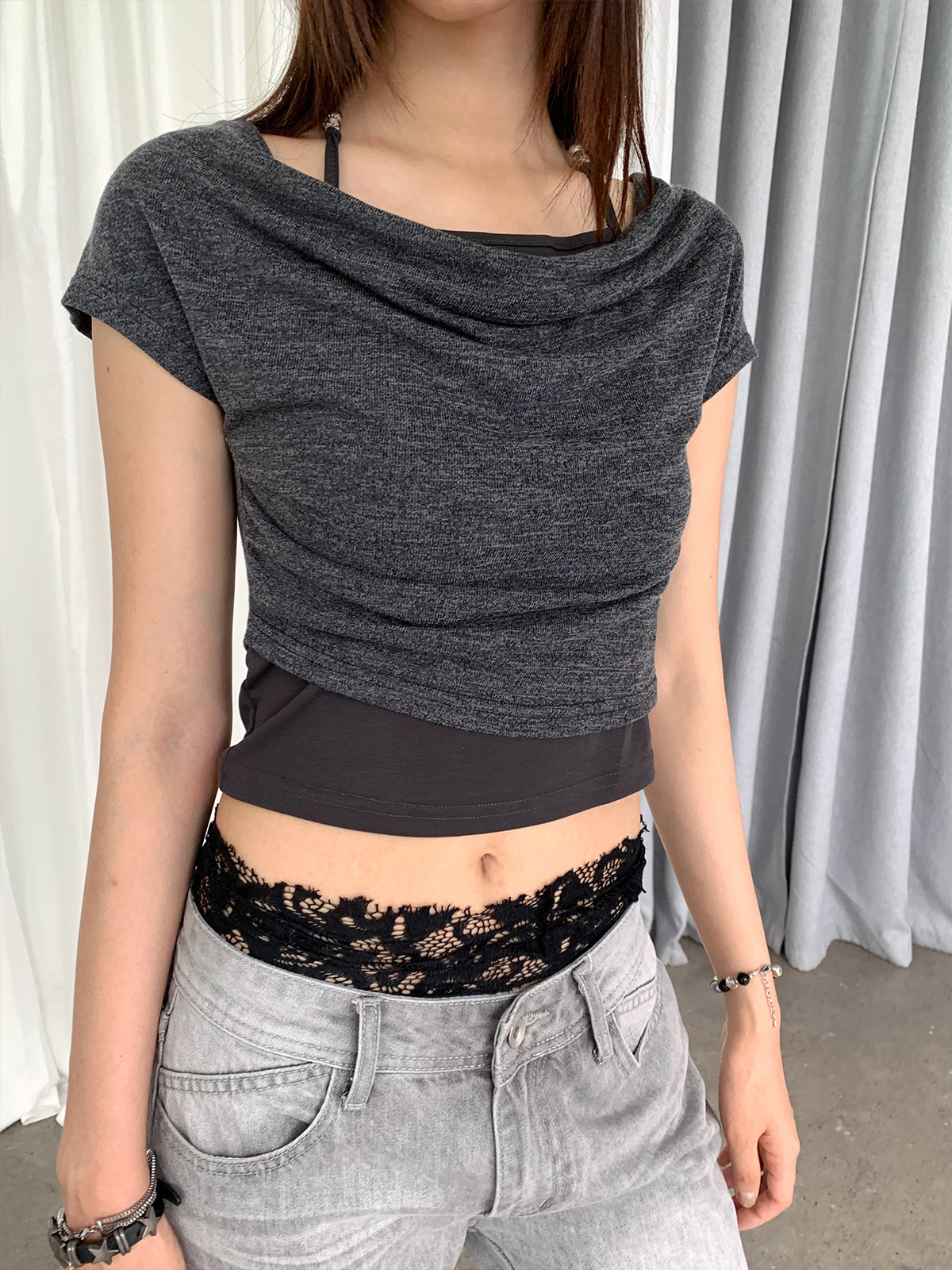 韩系夏季时髦撞色拼接假两件短款上衣挂脖荡领短袖T恤