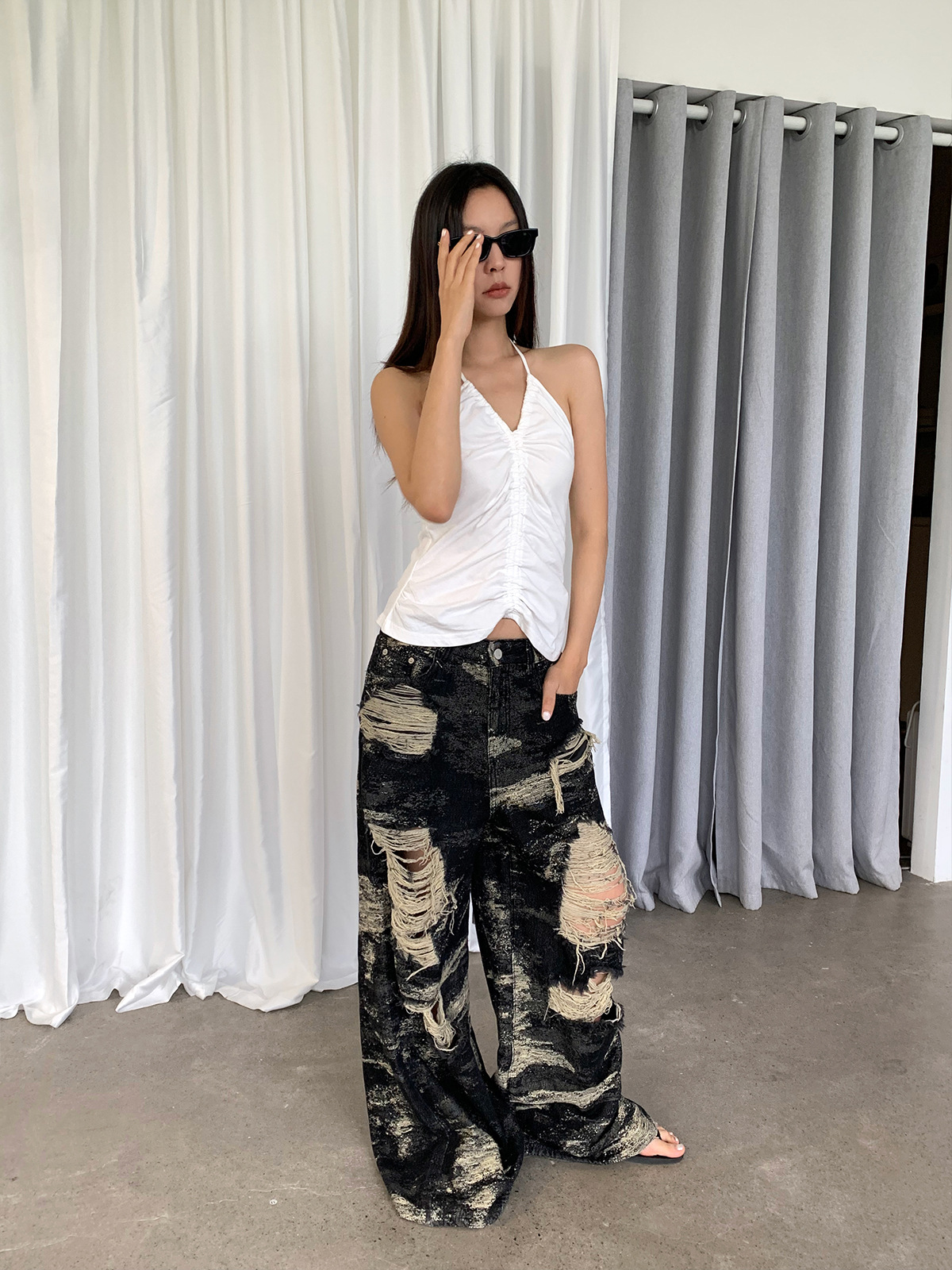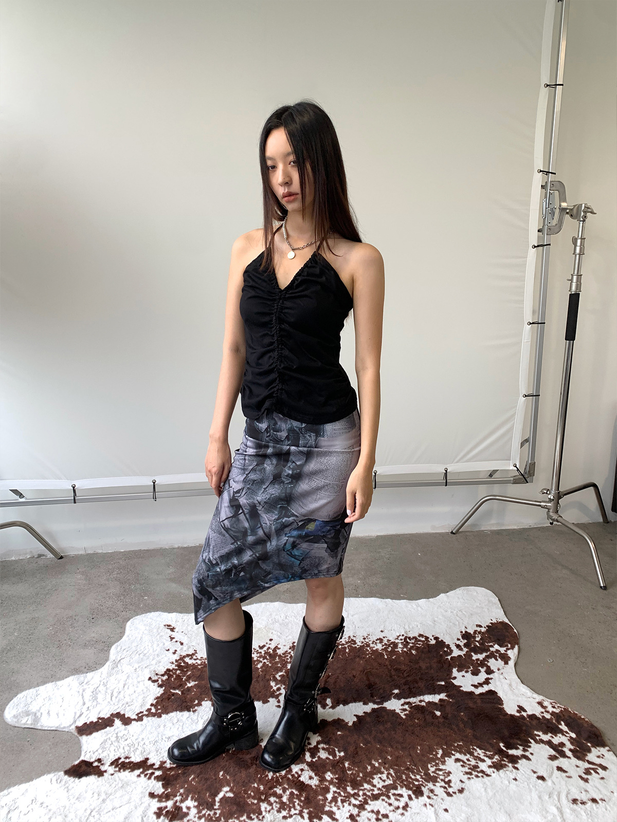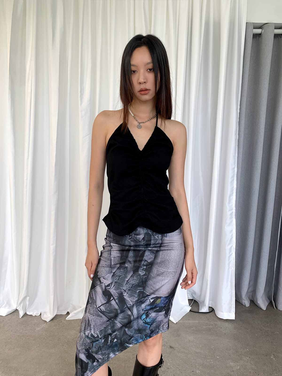 韩系街头辣妹穿搭设计感抽褶V领露背心吊带修身挂脖上衣女