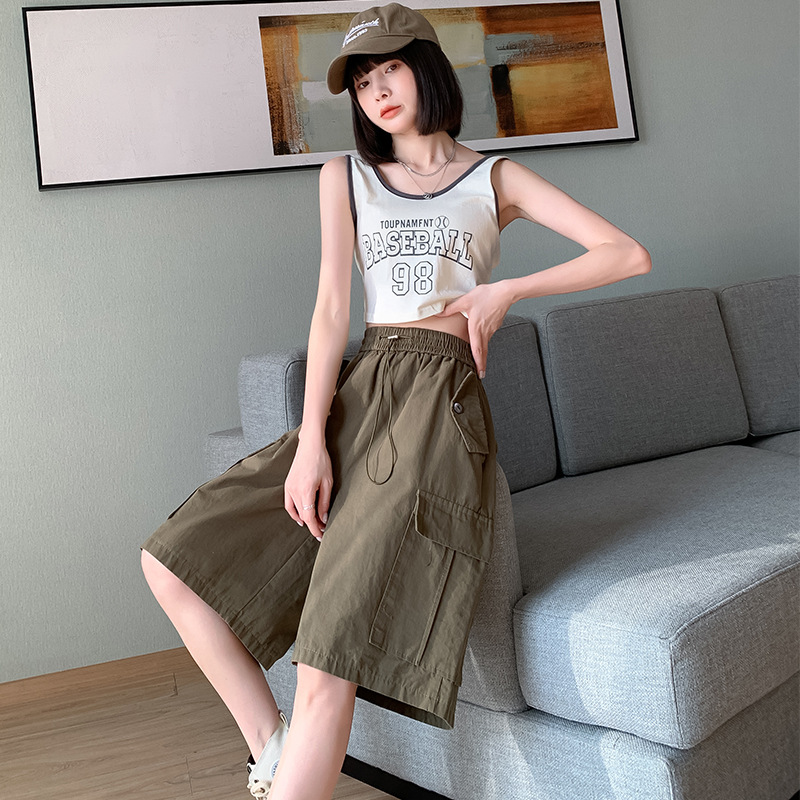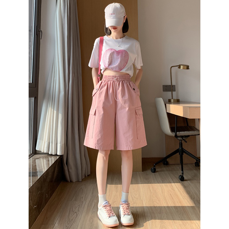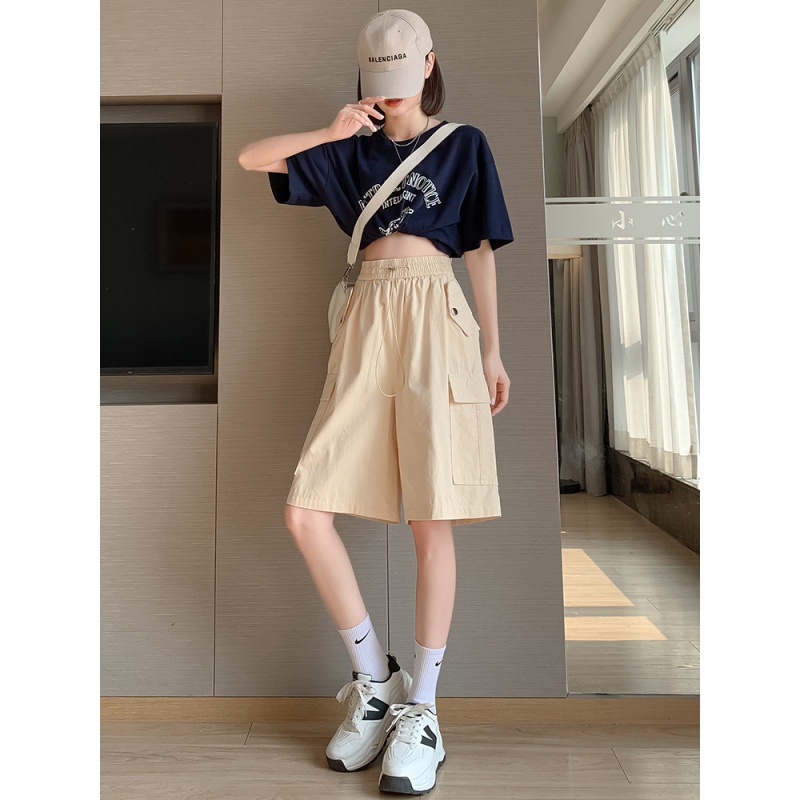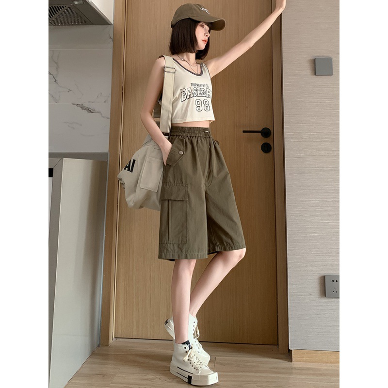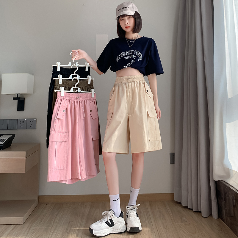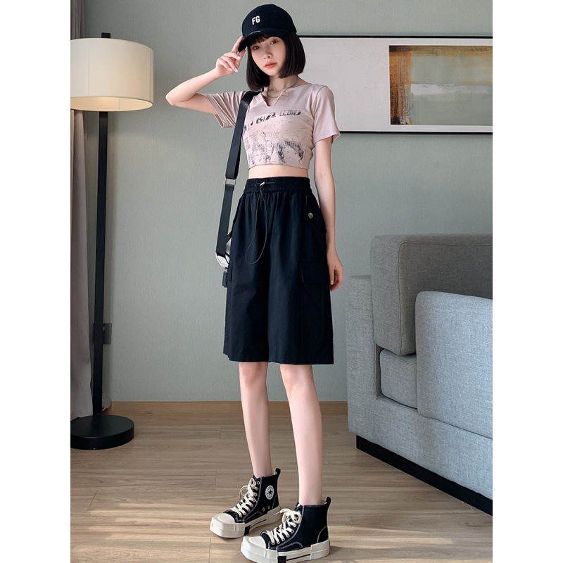 美式工装阔腿裤女夏薄款洗水棉休闲裤高腰辣妹百搭五分裤