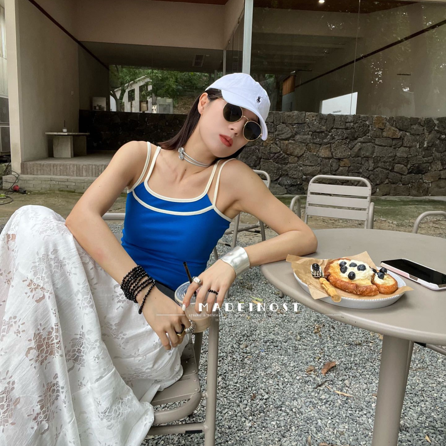 夏季美式复古撞色假两件吊带无袖辣妹上衣女背心
