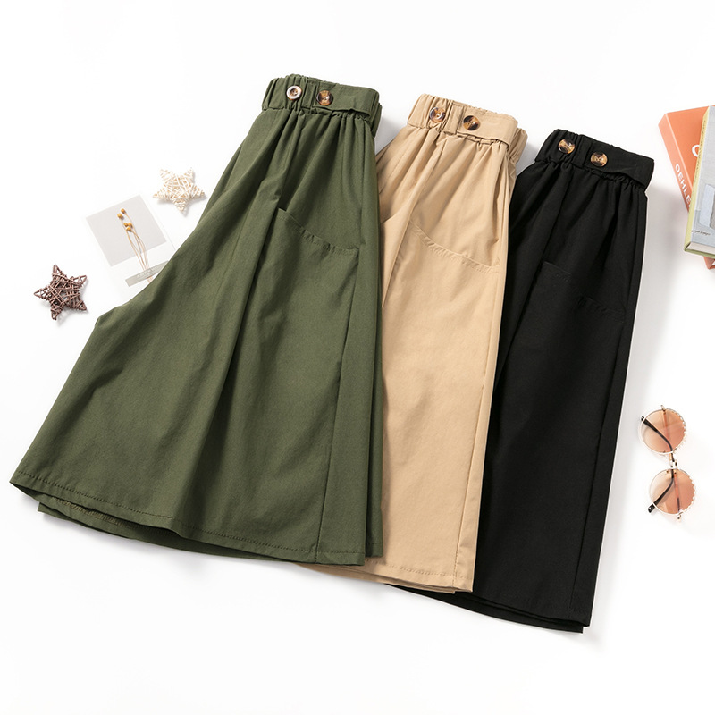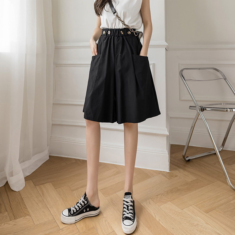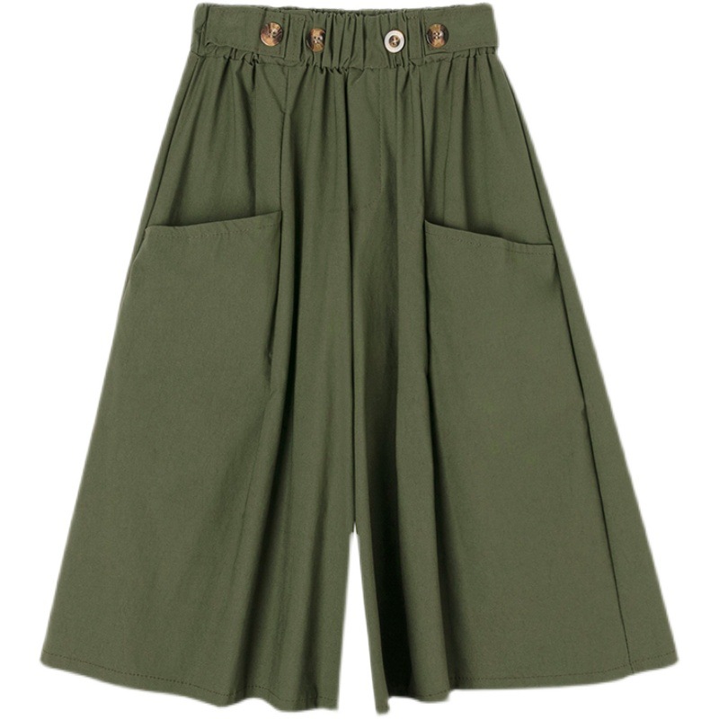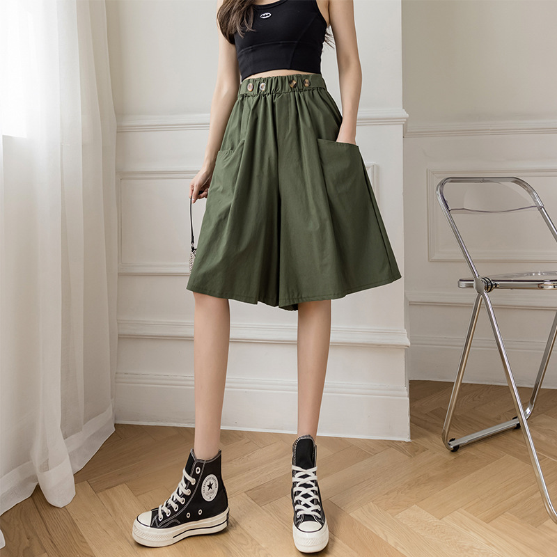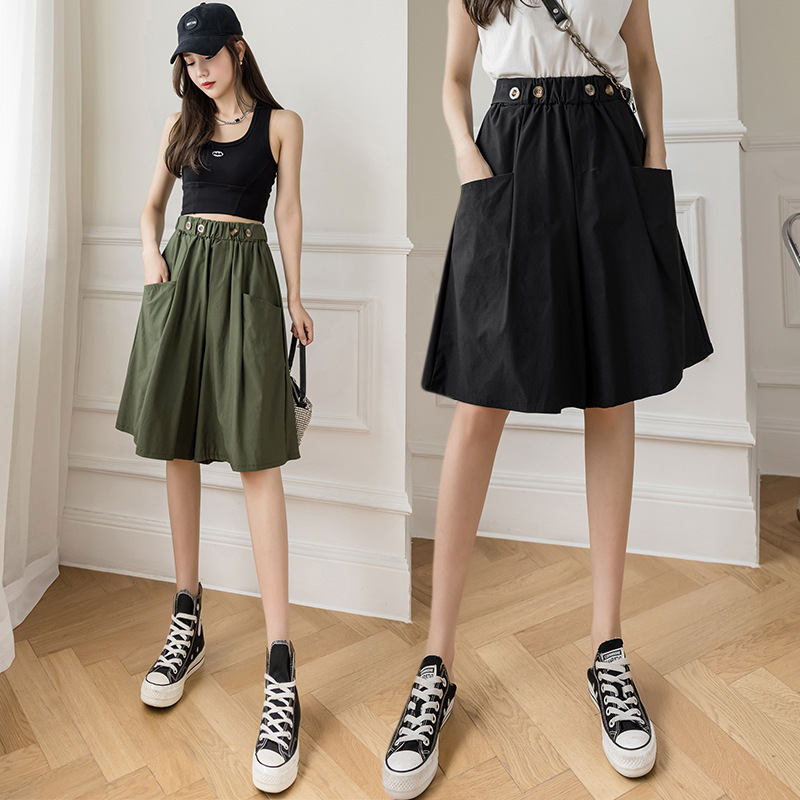 纯色五分阔腿裤女裤夏季高腰宽松外穿显瘦口袋中裤休闲裤裙