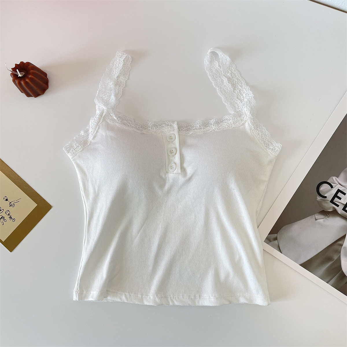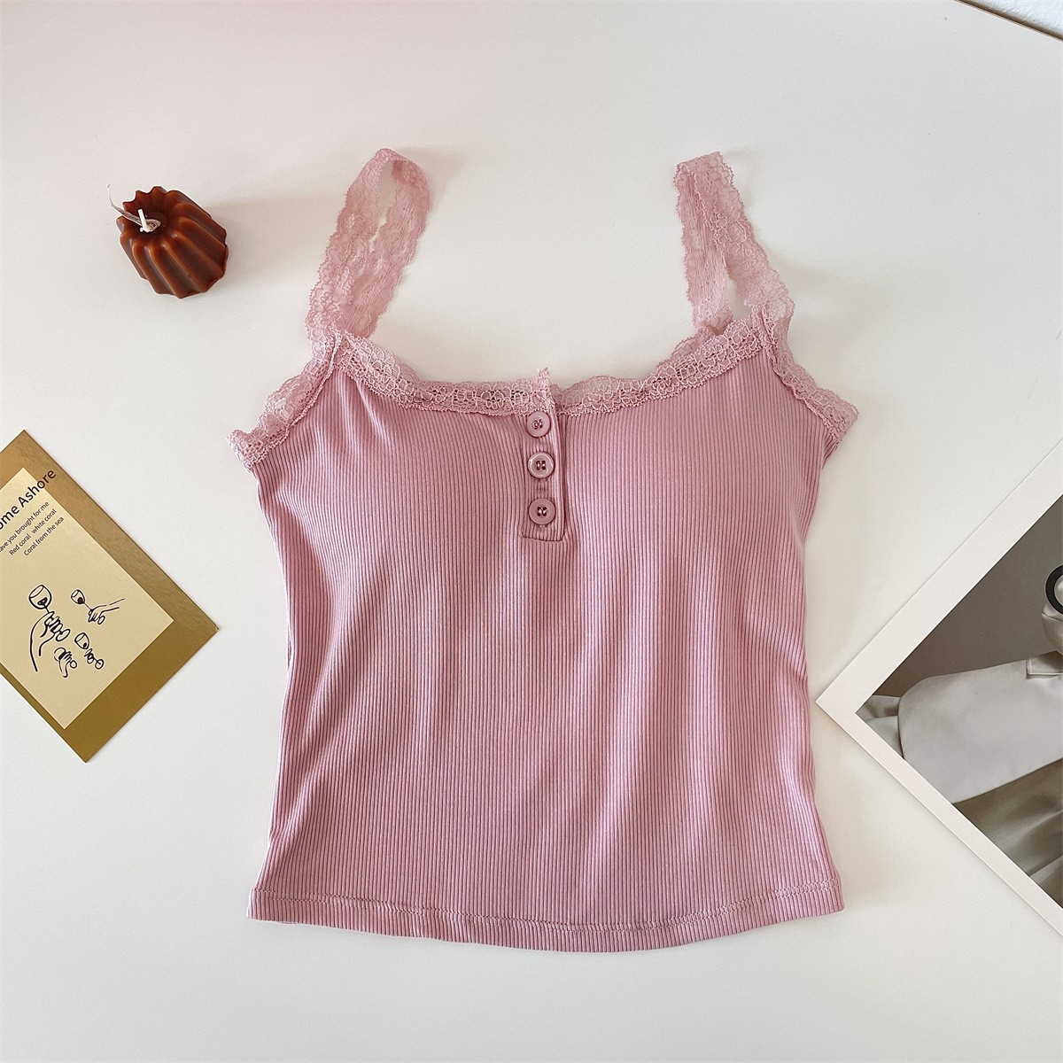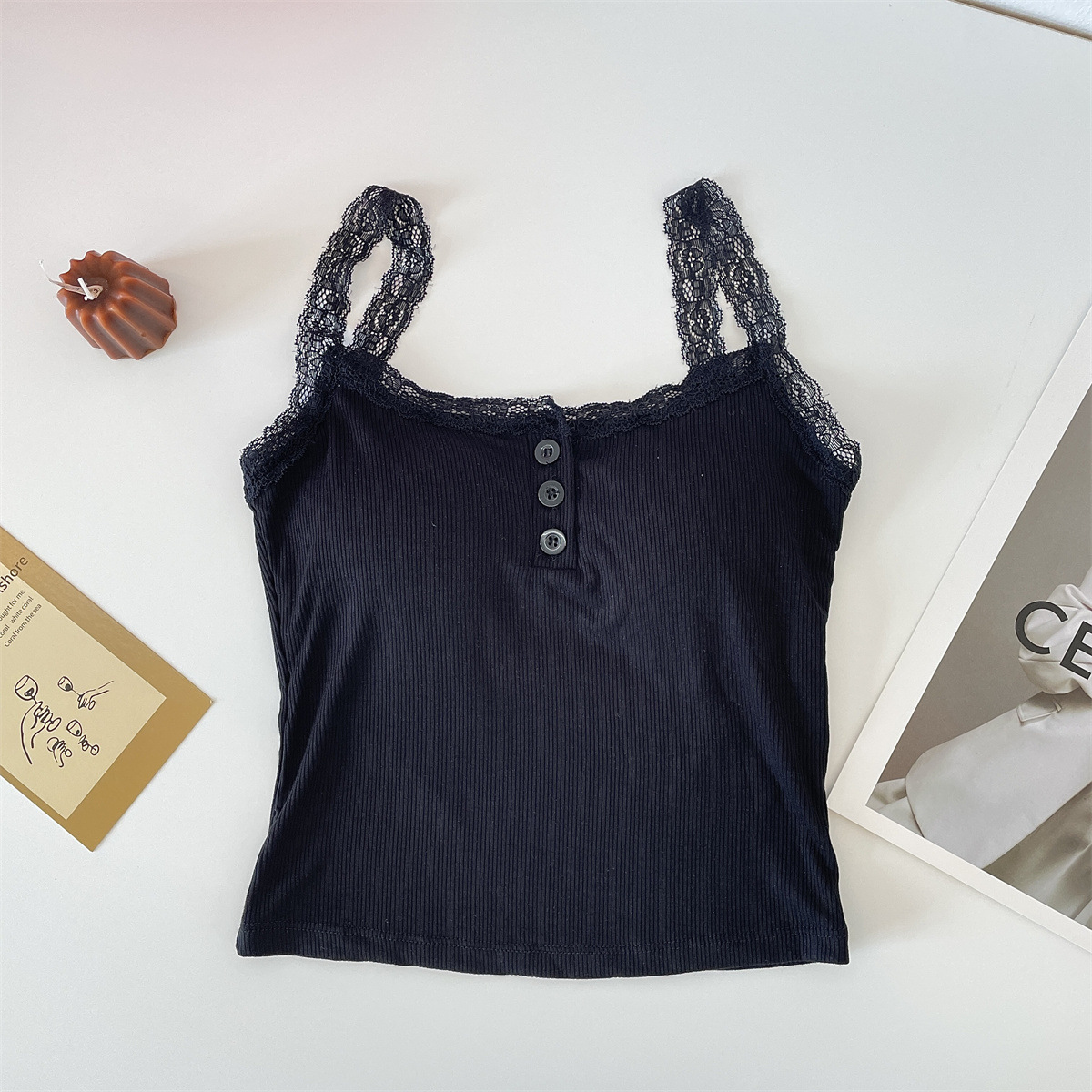 新款美背蕾丝吊带背心女胸垫夏季纯欲风辣妹短款外穿薄款纽扣上衣