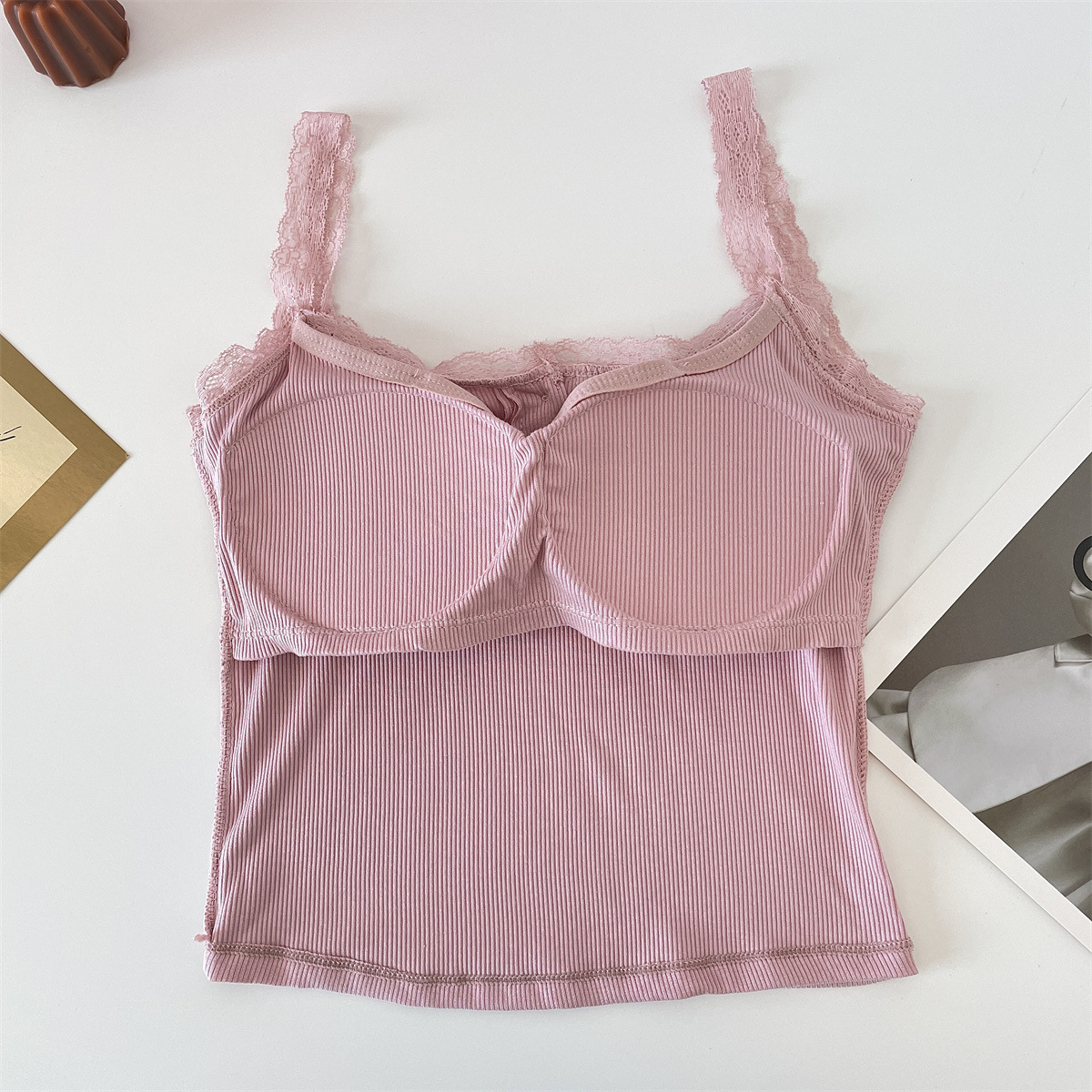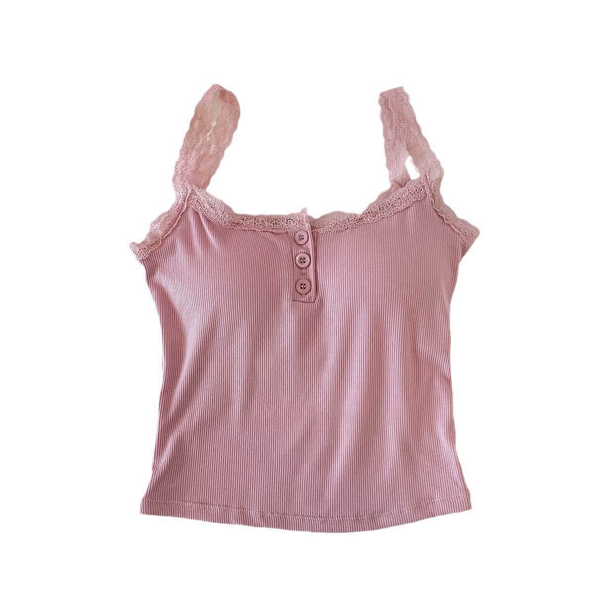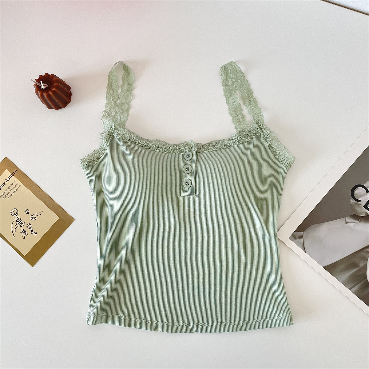 新款美背蕾丝吊带背心女胸垫夏季纯欲风辣妹短款外穿薄款纽扣上衣