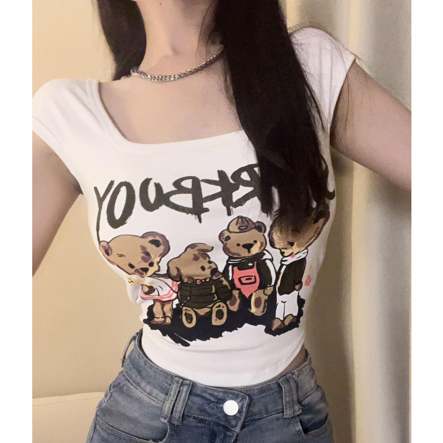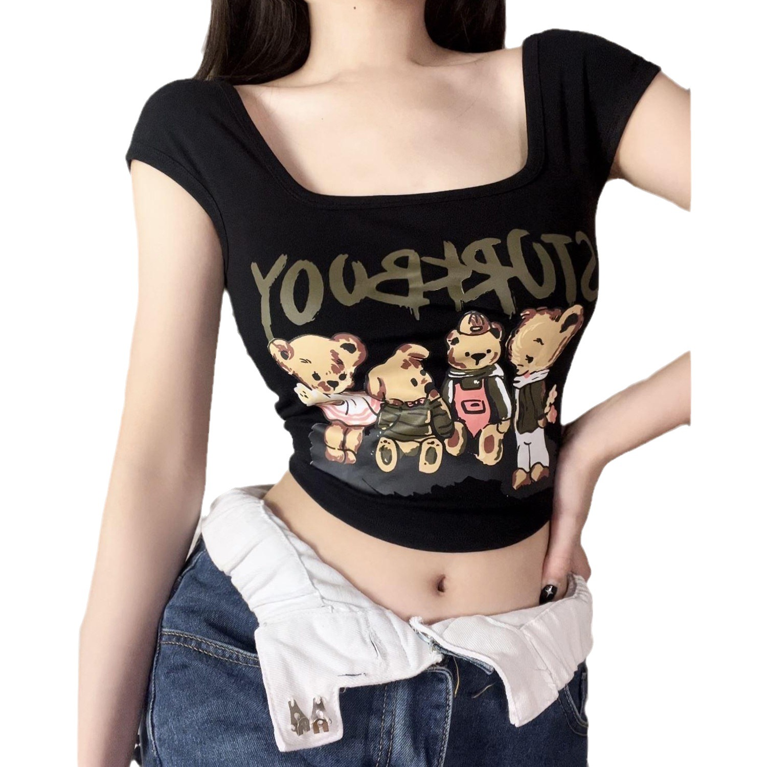 小熊印花辣妹背心女设计感百搭露背带胸垫修身打底美背短上衣夏季