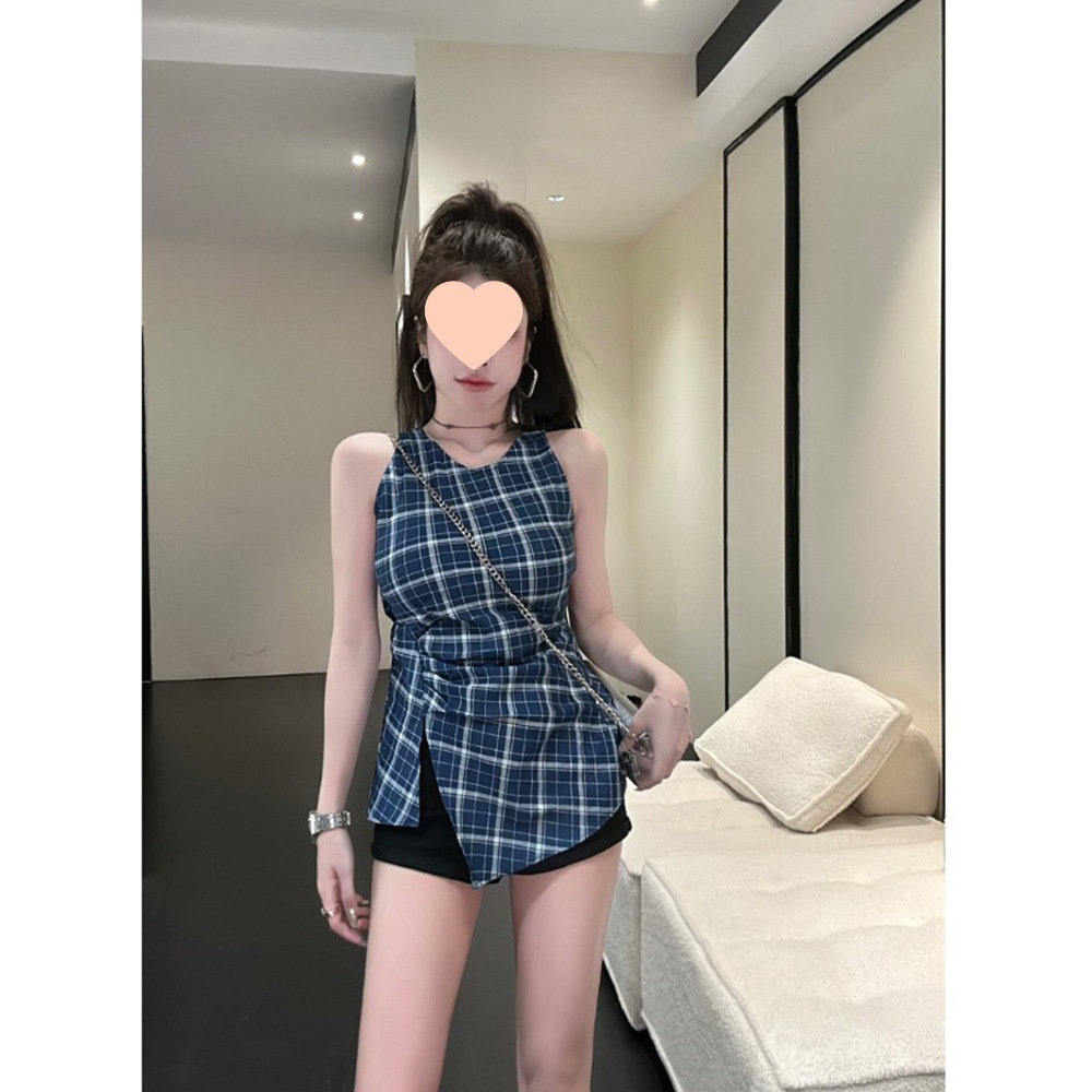韩版小众夏季新款法式别致复古格纹掐腰上衣无袖挂脖小衫女夏