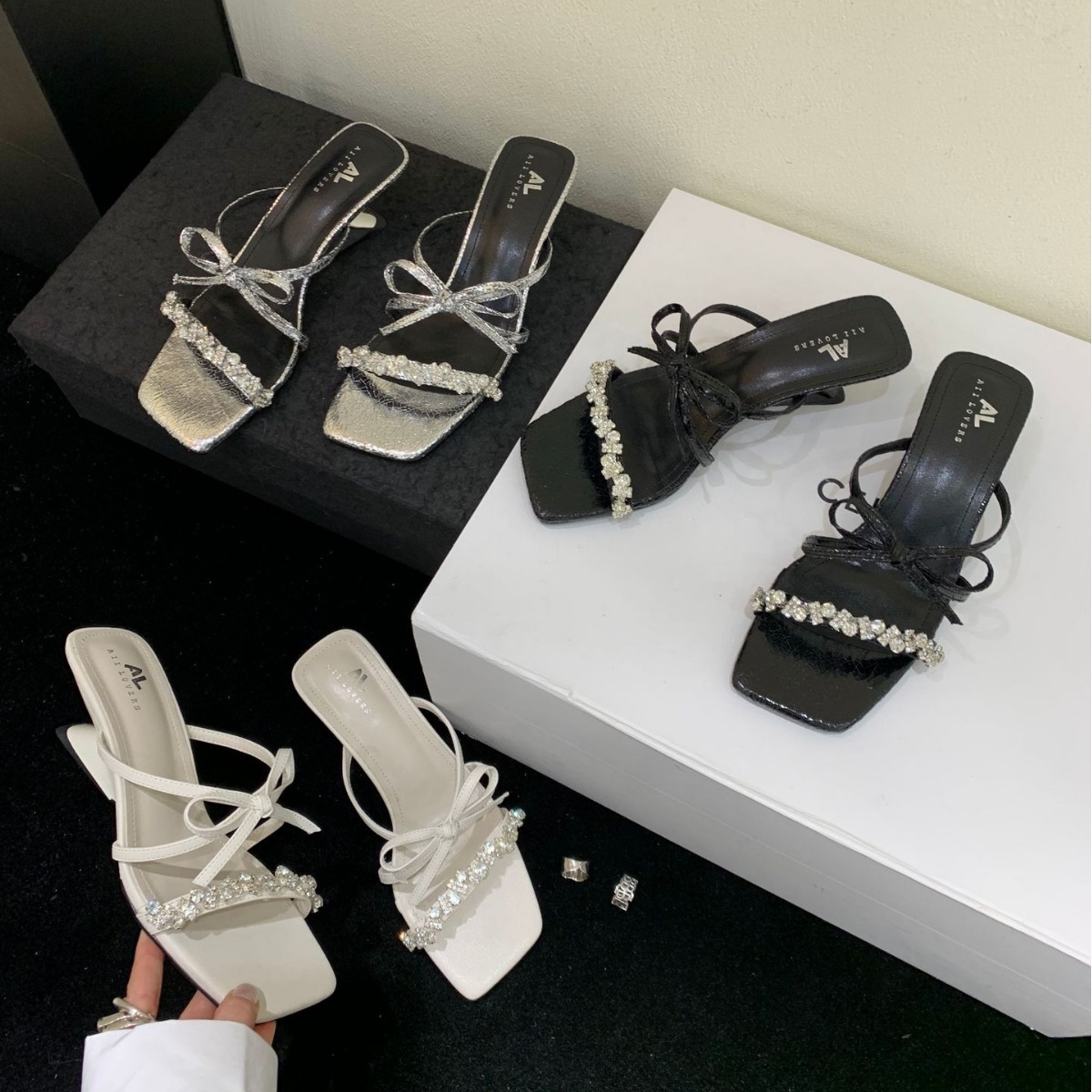 法式黑色蝴蝶结水钻凉拖鞋女夏季外穿新款仙女风绝美高跟凉鞋
