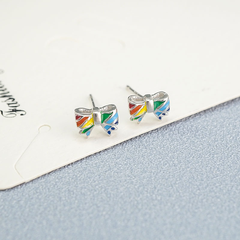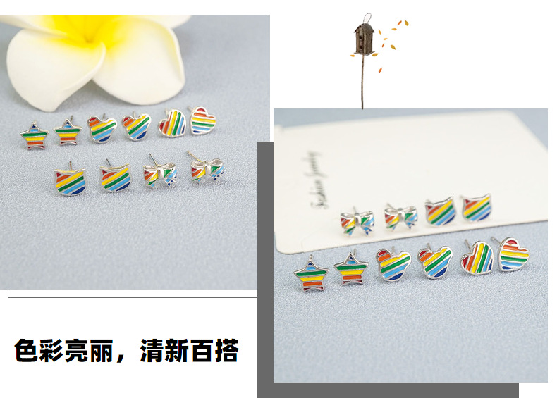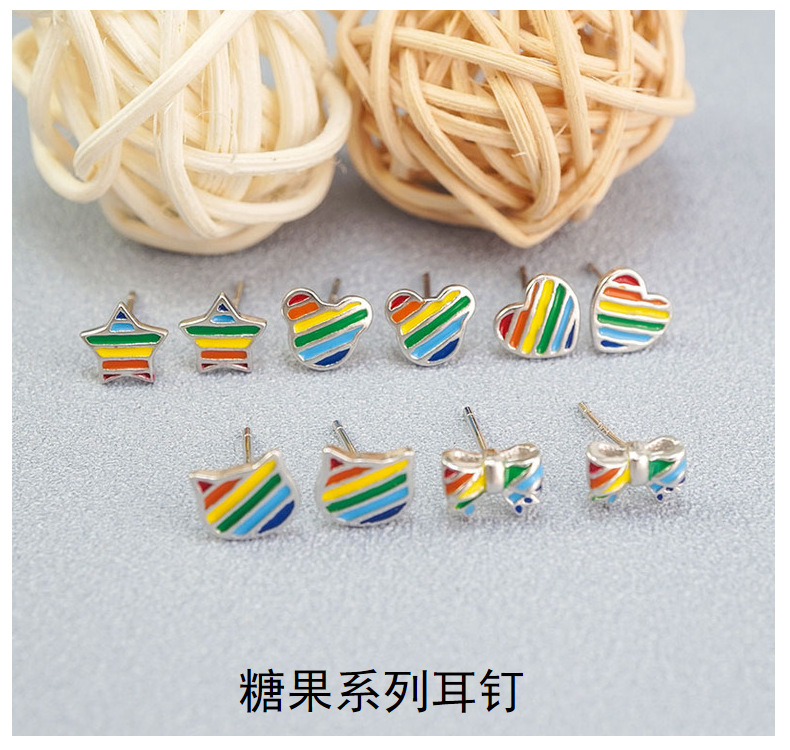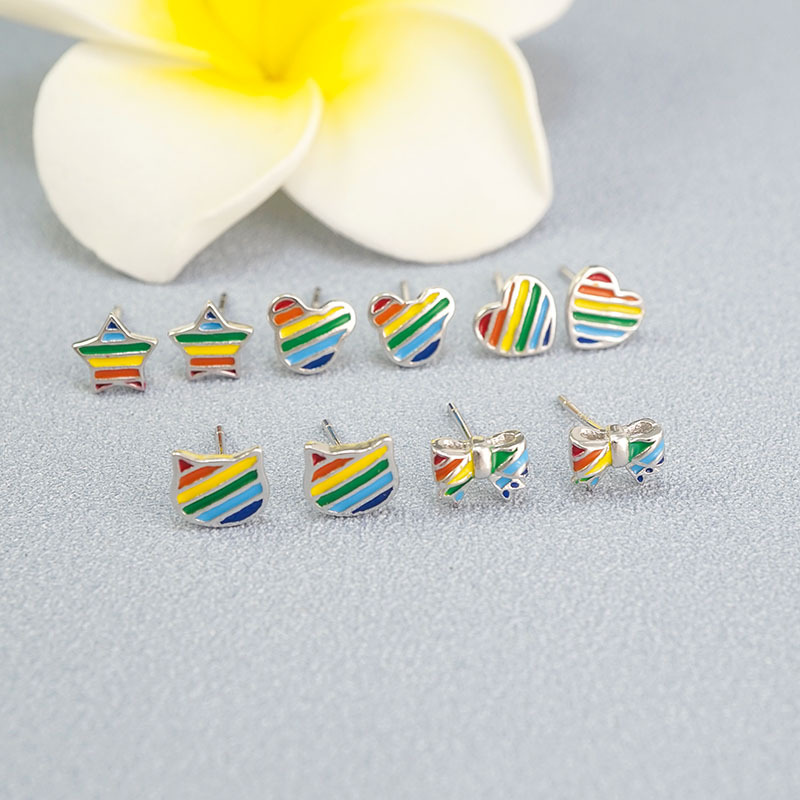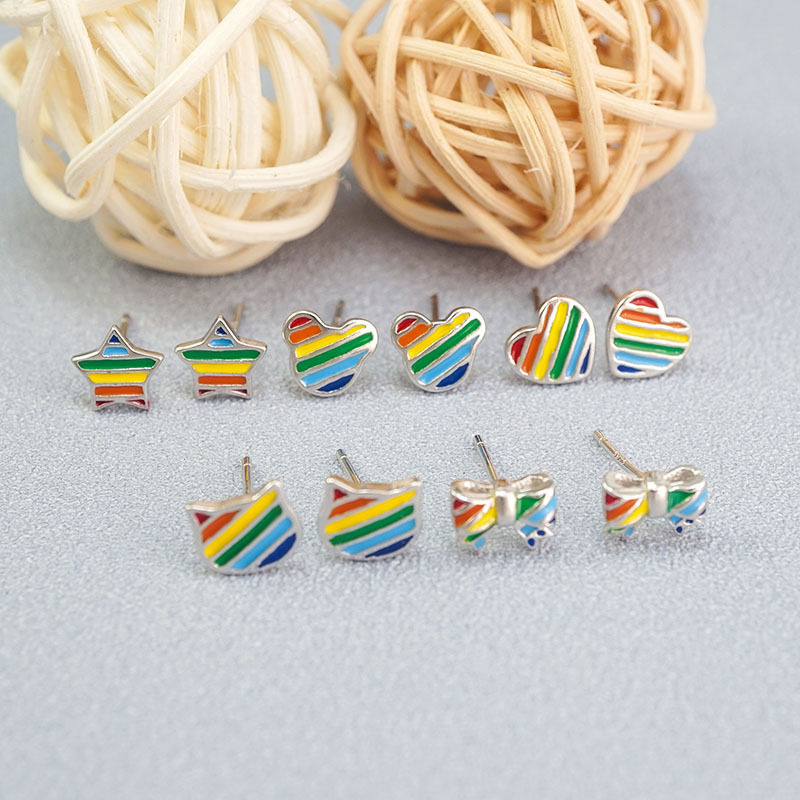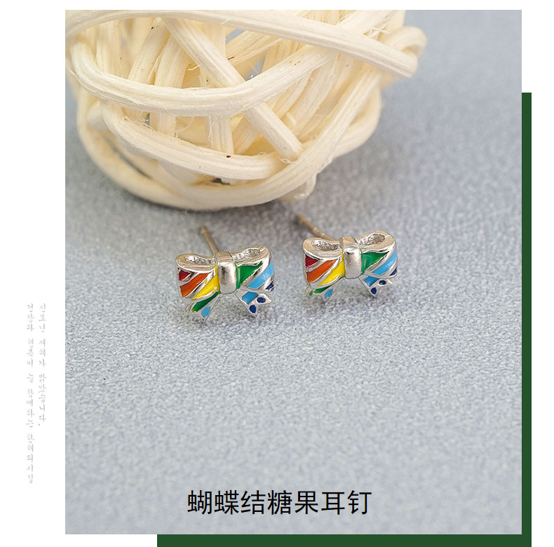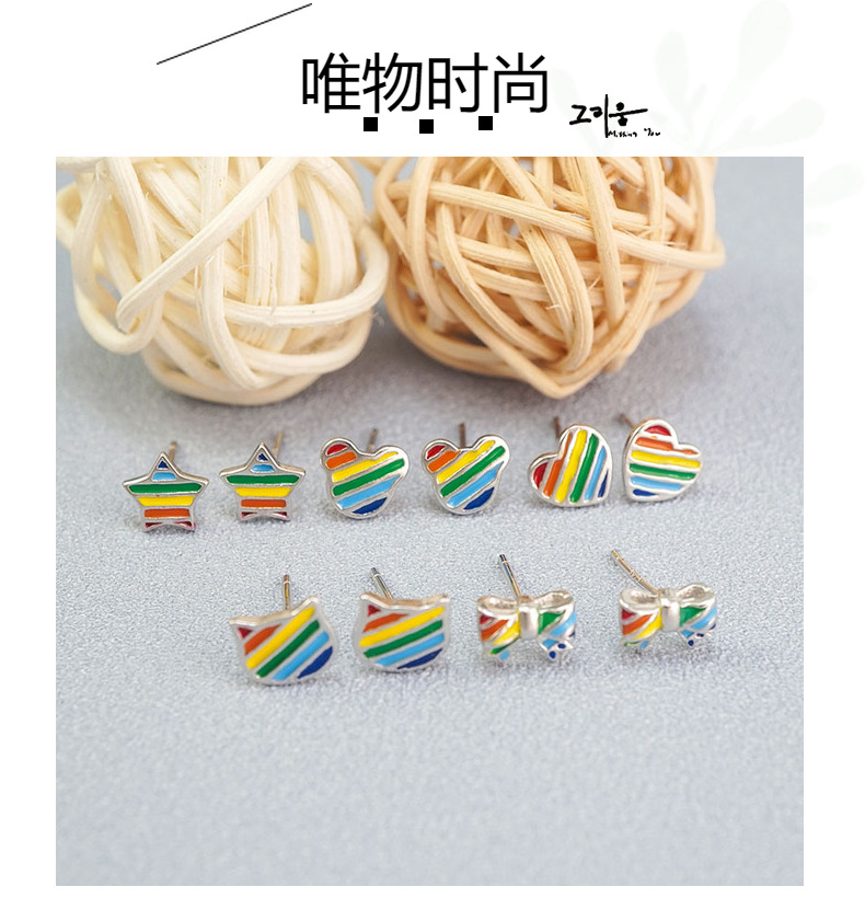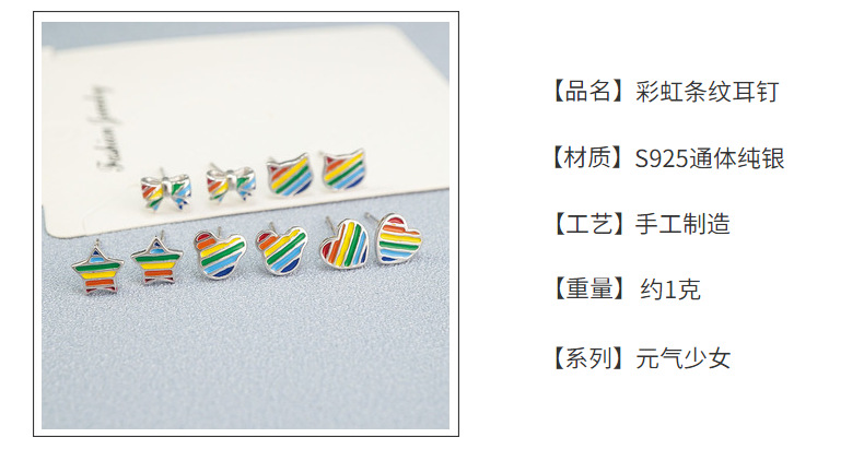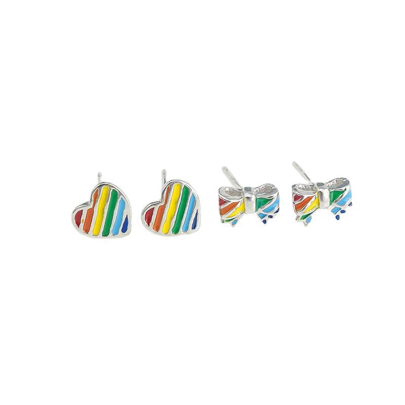 s999纯银简约森系彩虹爱心耳钉女韩版蝴蝶结甜美小清新星星耳饰