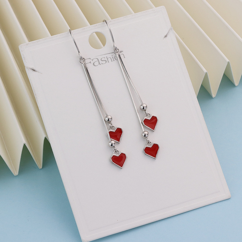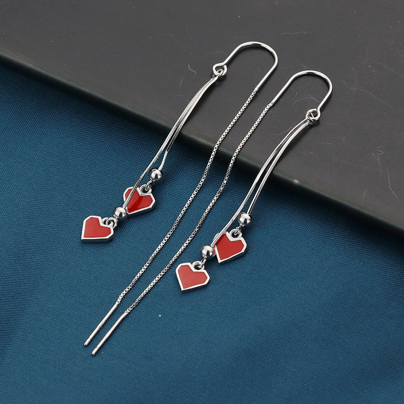 s925纯银时尚双爱心耳环女韩国气质长款流苏小红心滴胶耳饰