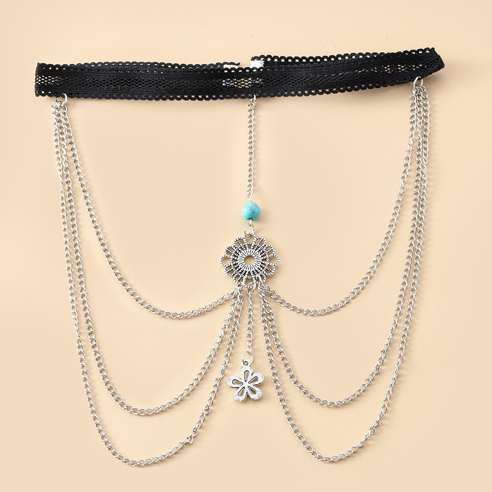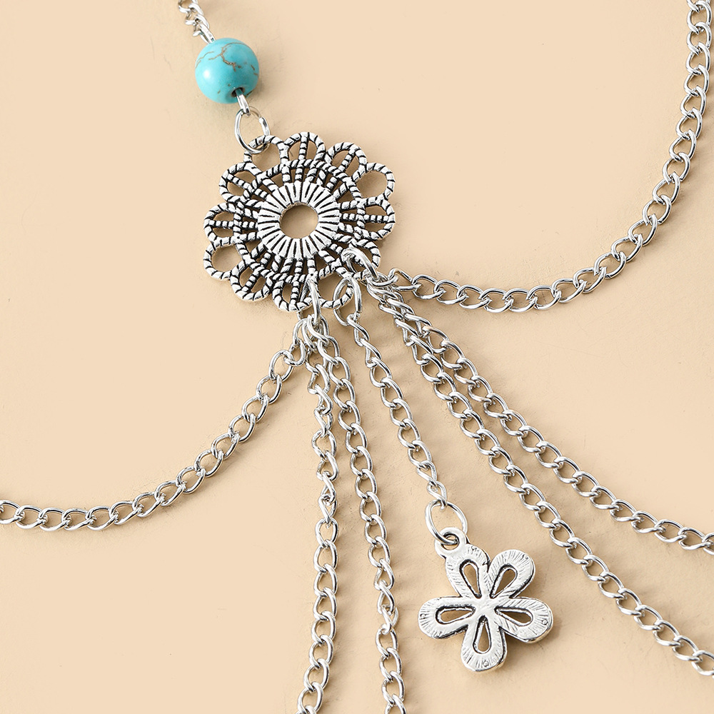 欧美风时尚多层流苏腿链复古朋克风松石金属小花弹力性感美腿身体链