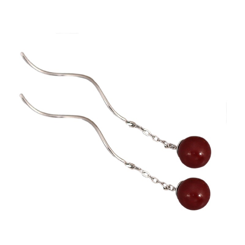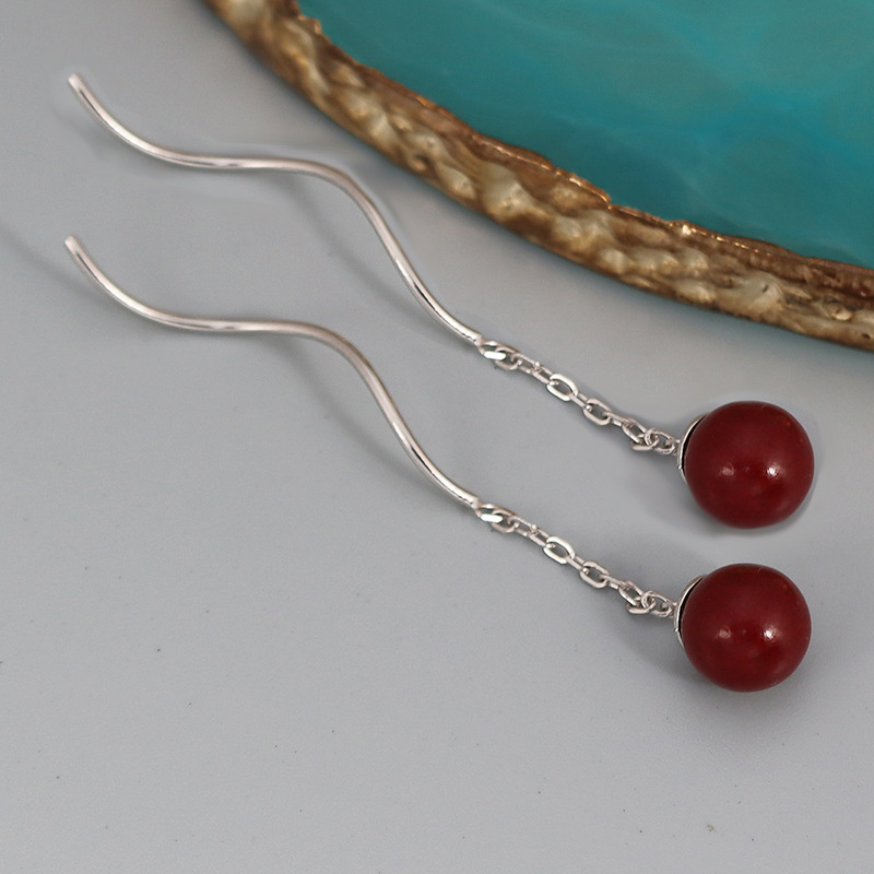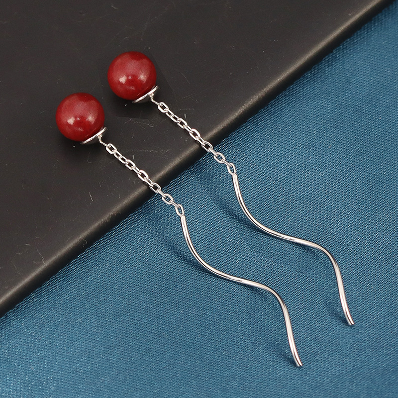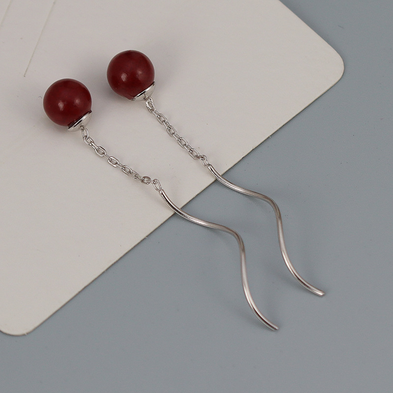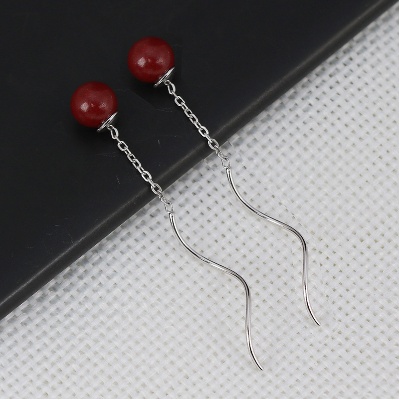 S925纯银天然朱砂波浪耳线韩版简约红圆珠耳坠女感气质耳环
