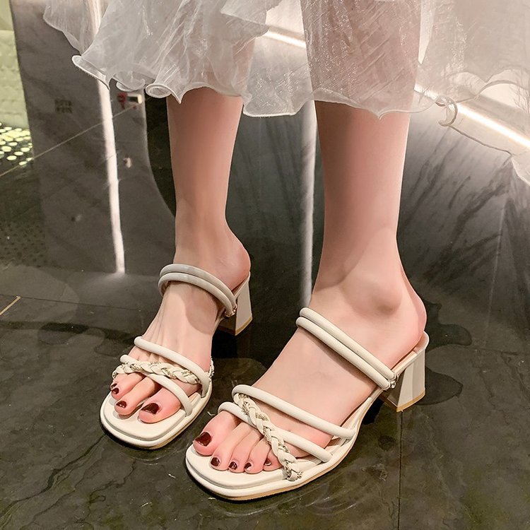 夏季新款粗跟拖鞋女外穿露趾一字高跟鞋时尚两穿凉鞋