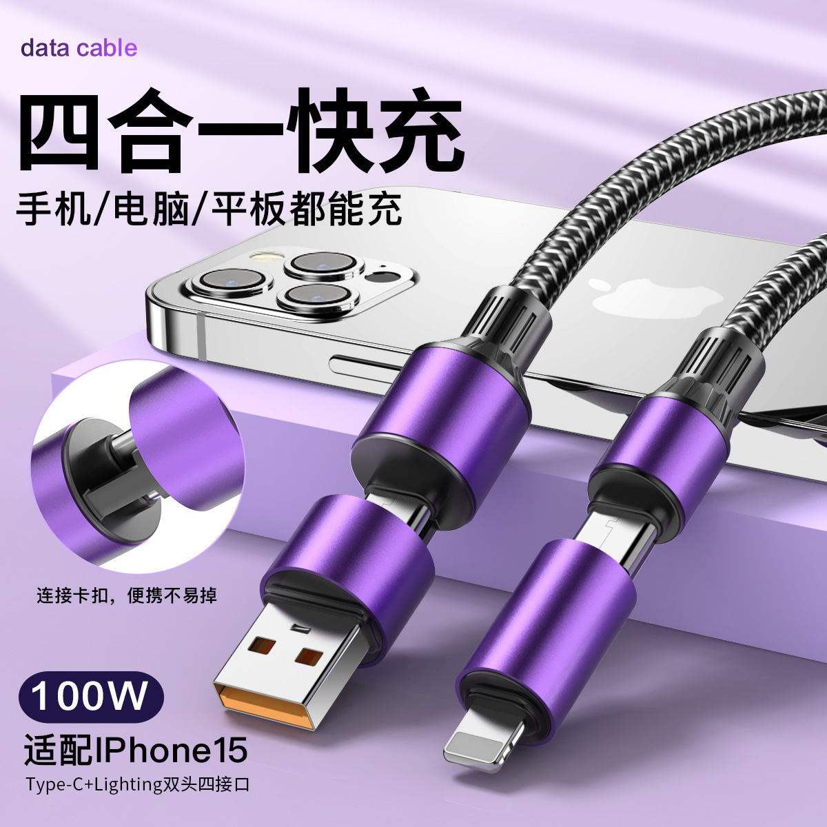 100W超级快充数据线四合一PD适用苹果15快充华为Type-c车载充电器