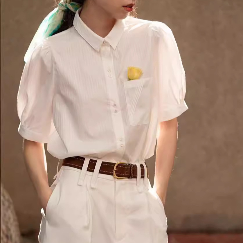 法式气质翻领浮纹白泡泡袖衬衫女夏季设计感小众通勤别致短袖上衣