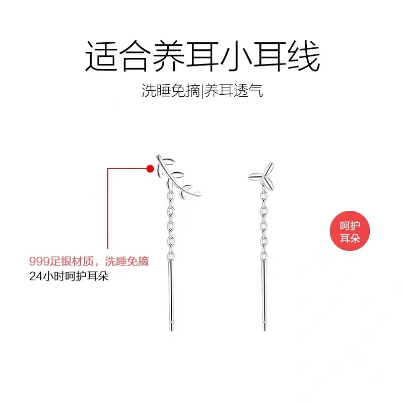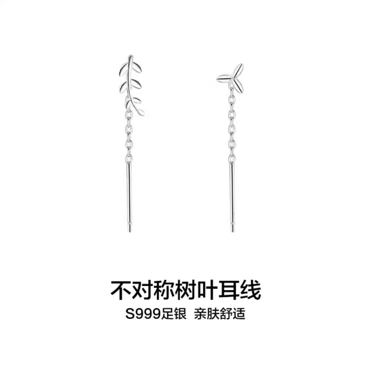 S999足银不对称树叶耳线女轻奢小众设计耳环养耳洞洗睡免摘耳饰