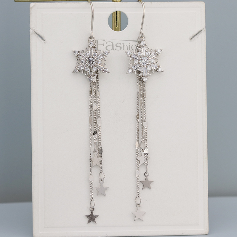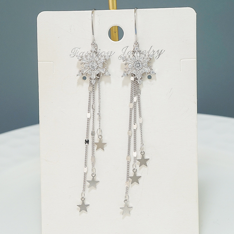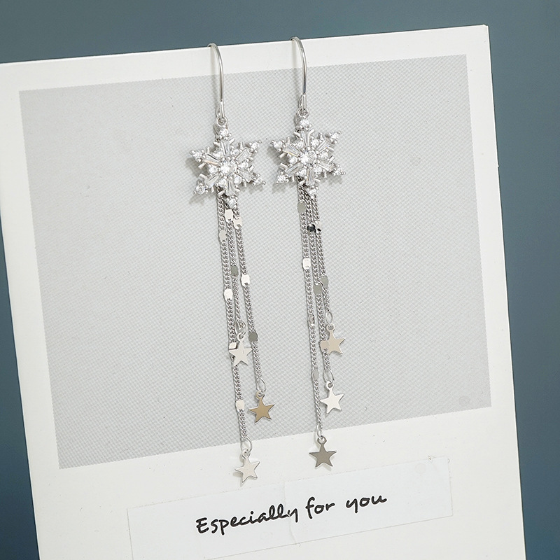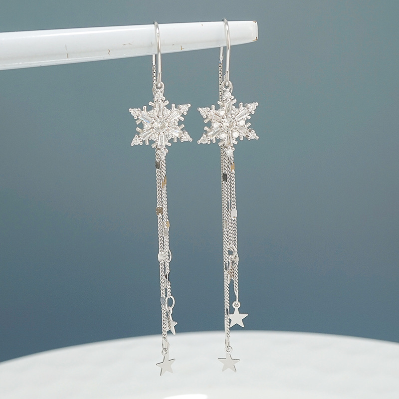 S999纯银雪花流苏耳线 韩版百搭时尚长款耳环 气质感星星耳饰女