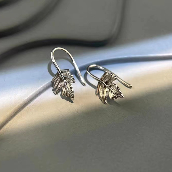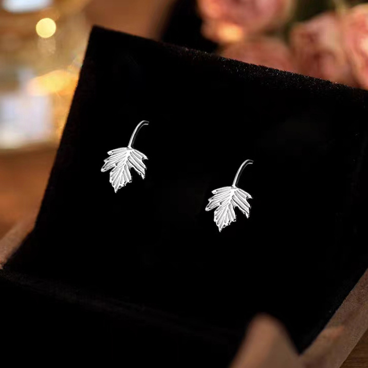 S999纯银耳钉女夏枫叶养耳洞睡觉免摘耳勾简约时尚通勤耳饰品