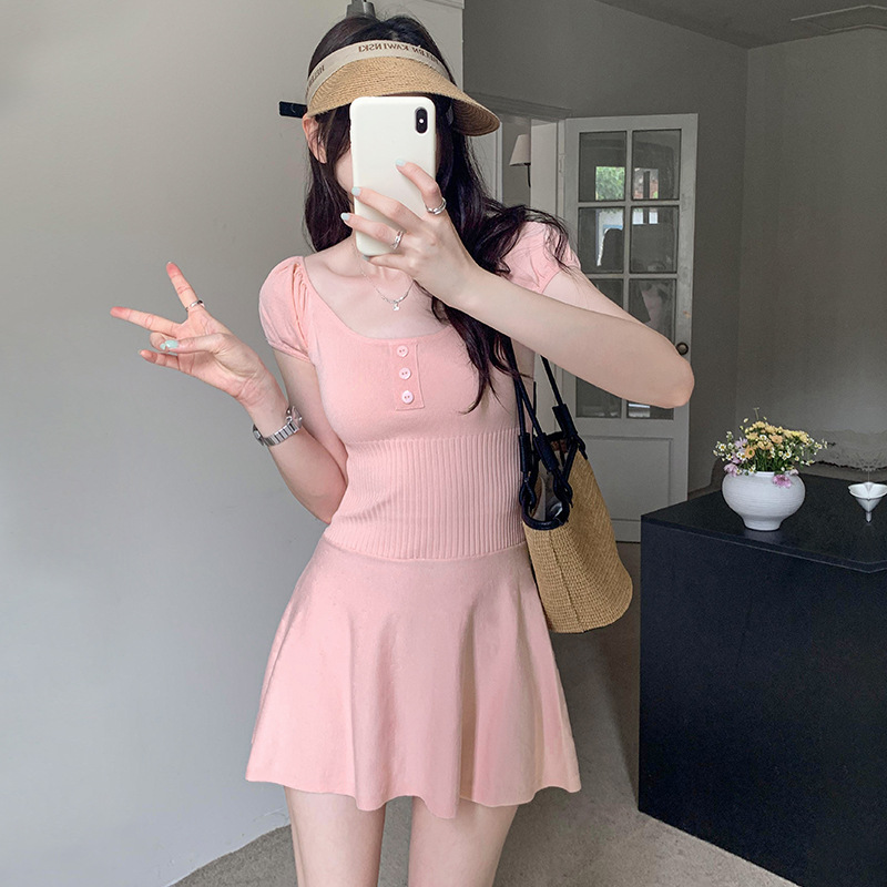 纯欲风温柔甜美泡泡袖粉色短袖针织连衣裙女装芭蕾裙子修身短裙
