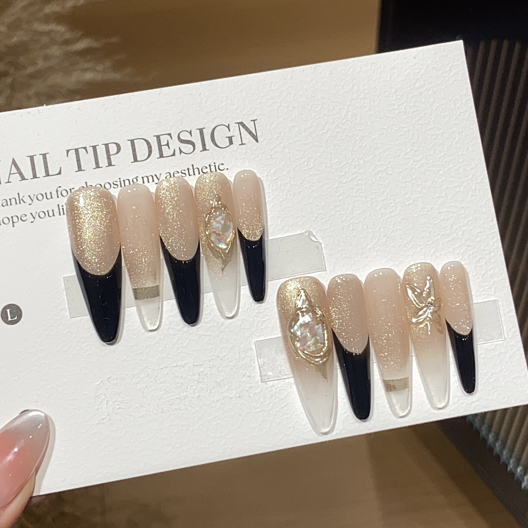 一只顾美甲【Y】 纯手工高级渐变黑法式金色魔镜粉细闪幻影贴片