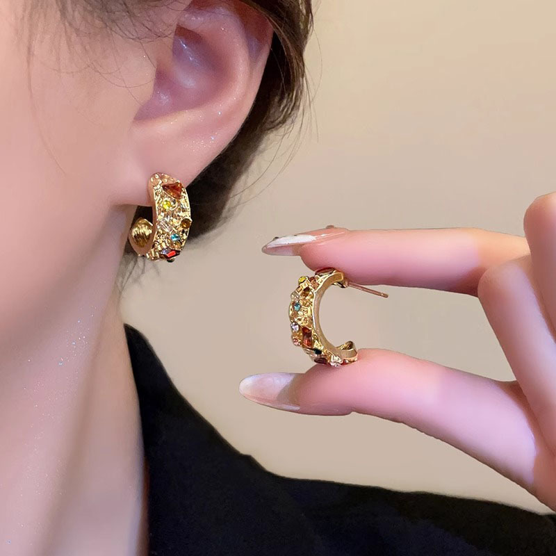 小众复古彩色水钻耳钉女轻奢气质弧形设计感金属重工耳圈耳环耳饰