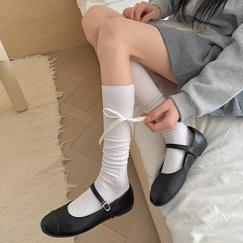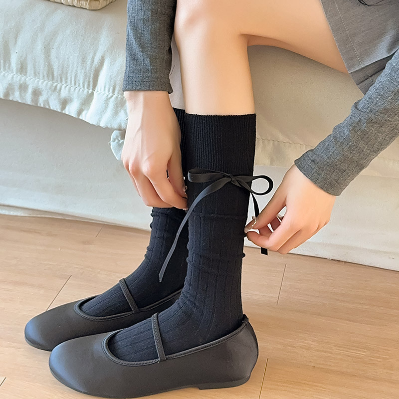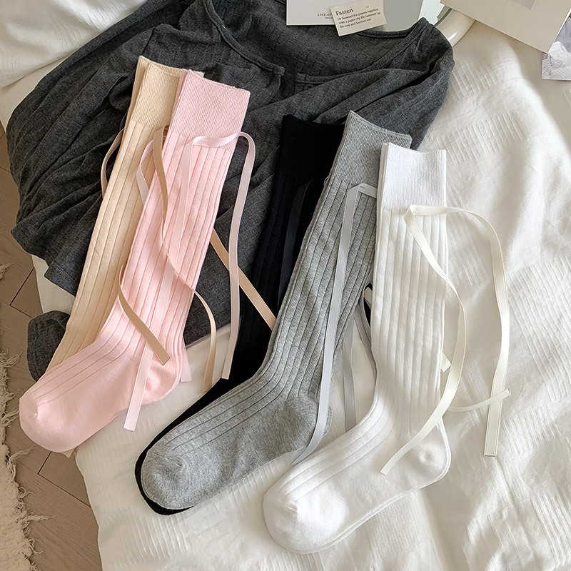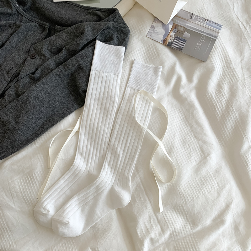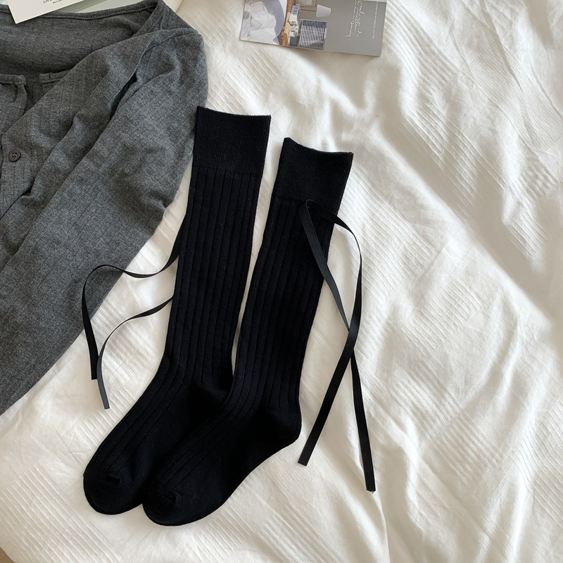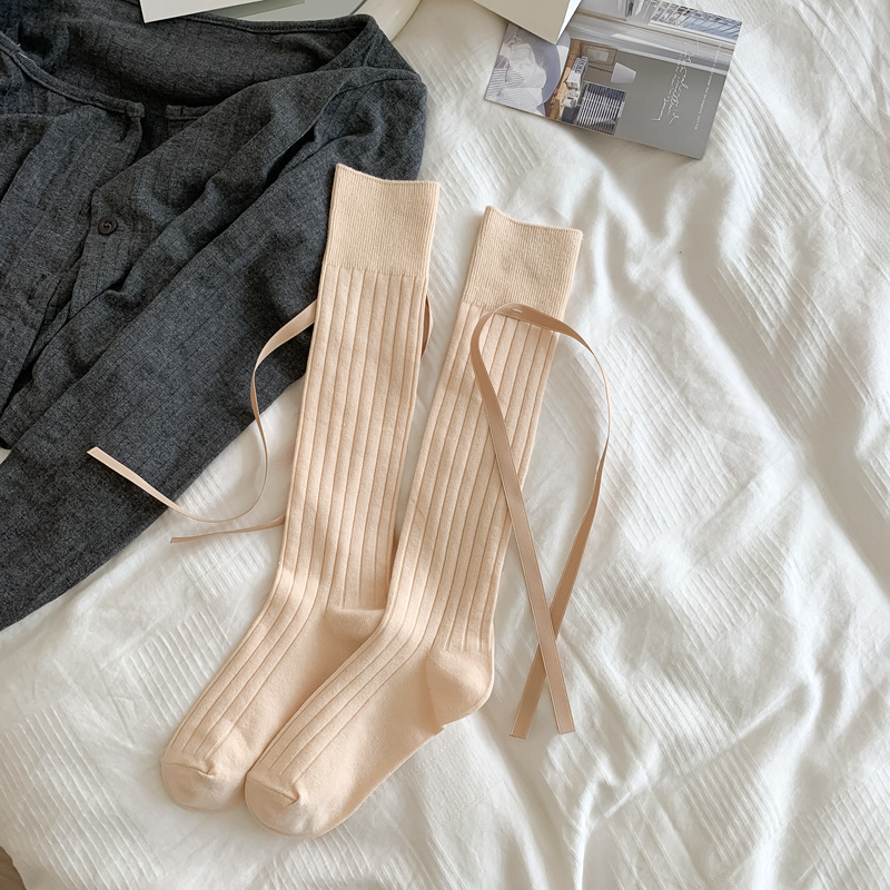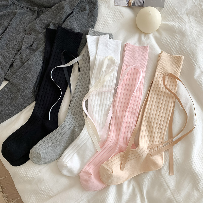 小腿袜女jk纯色少女甜美丝带蝴蝶结袜日系学生竖条纹长筒堆堆袜子