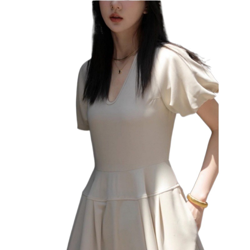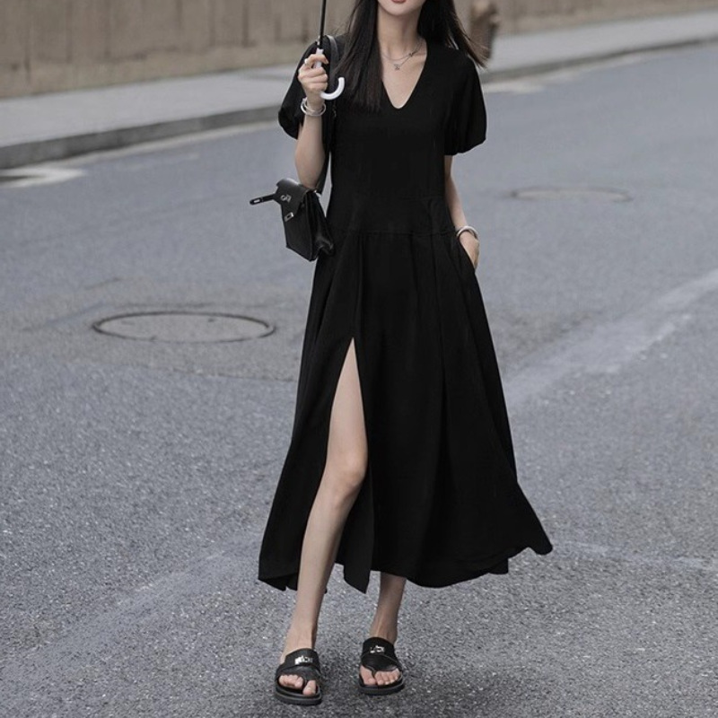 法式复古赫本风小黑裙夏季新款气质显瘦泡泡袖开叉V领连衣裙