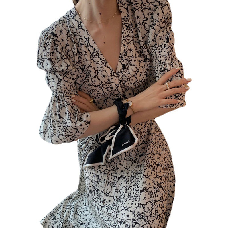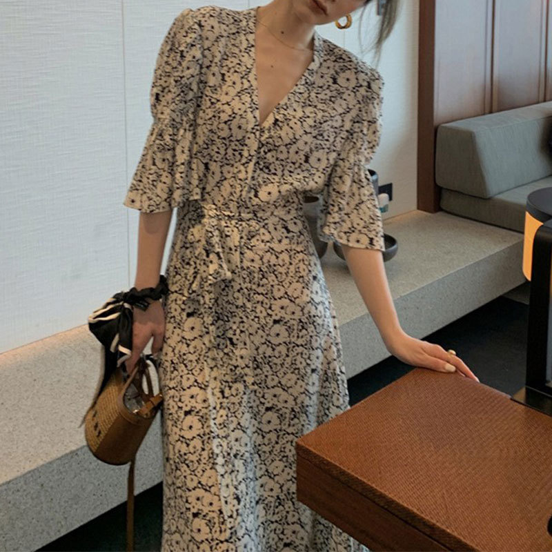 夏季新款韩版时尚温柔风女人味气质印花V领连衣裙子女潮ing