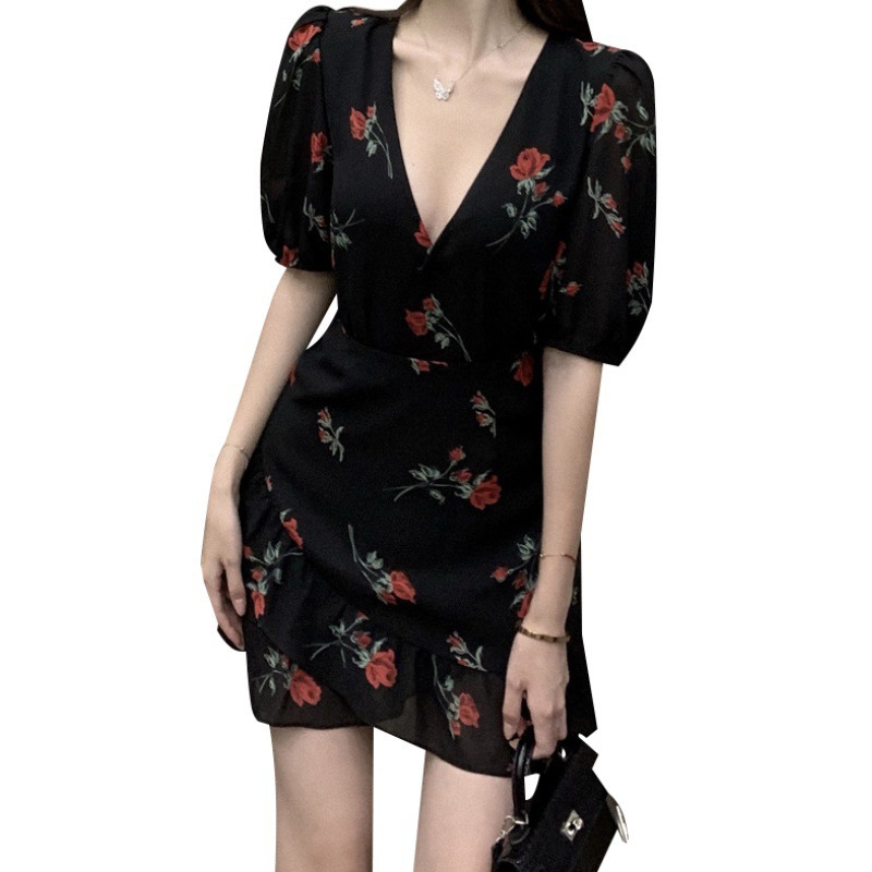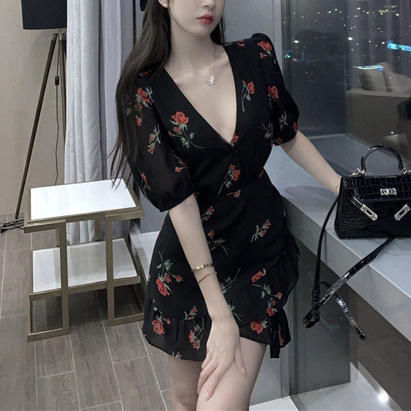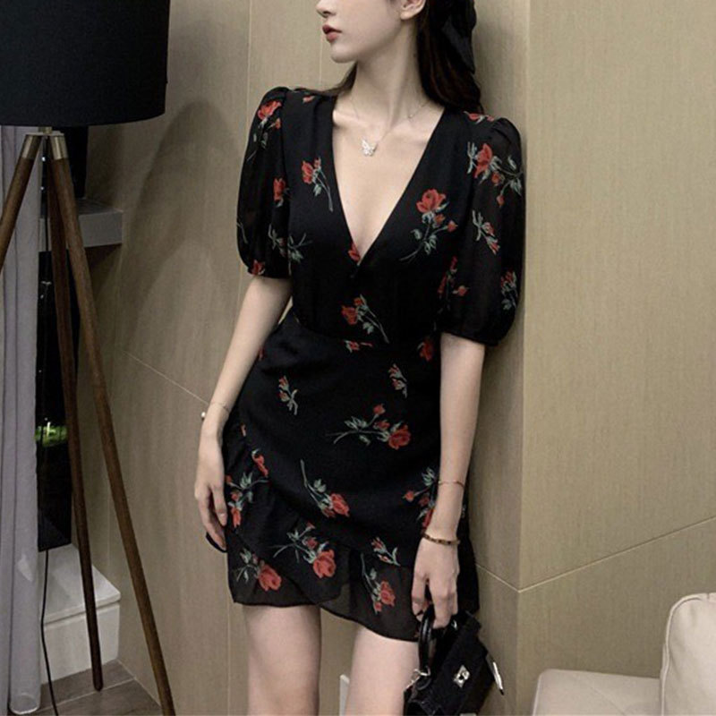 夏季夏季法式性感收腰显瘦小个子短裙泡泡袖V领碎花连衣裙