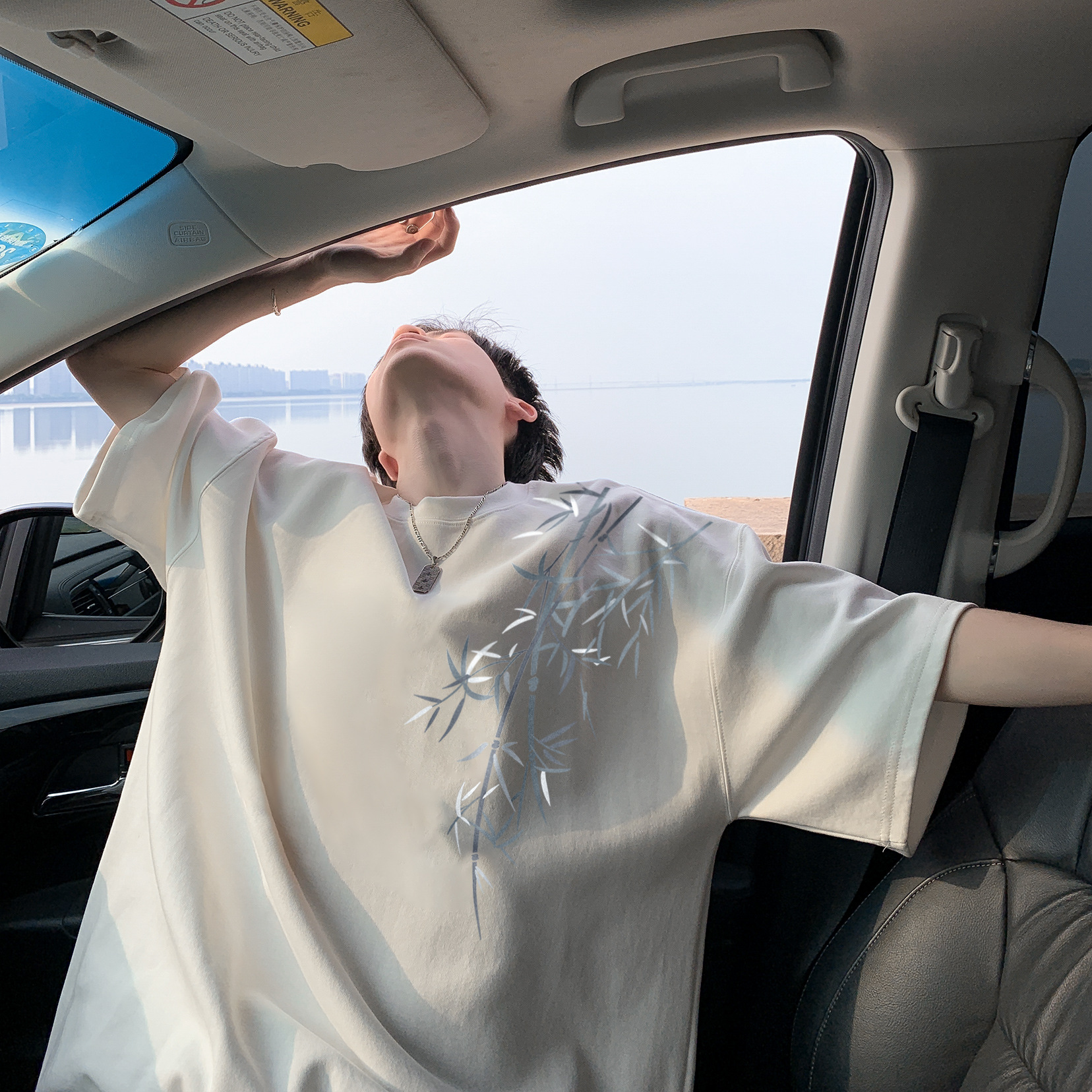 新中式国风竹子重磅短袖t恤男潮牌纯棉宽松大码高街半袖体港风t恤