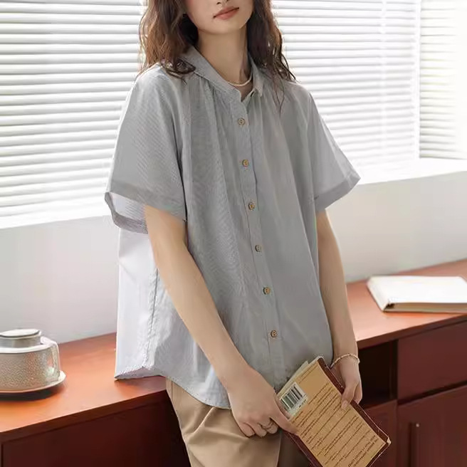 复古Polo领气质有版型抽皱黑白细格百搭通勤衬衫女夏新款