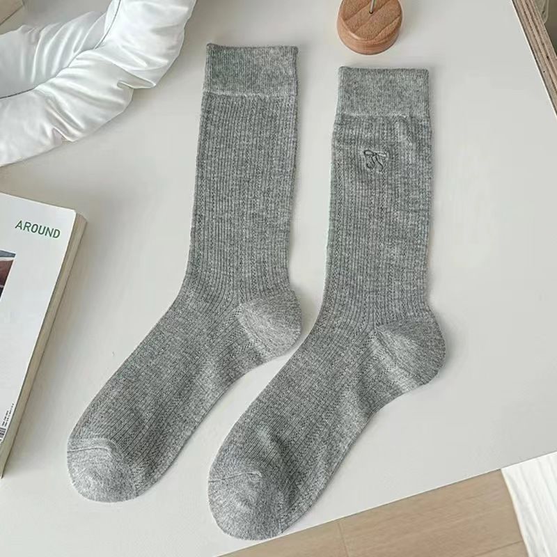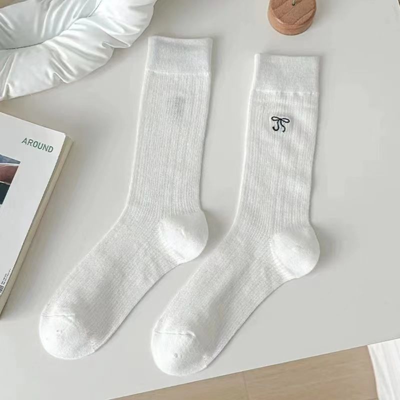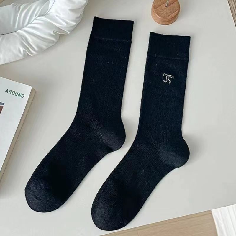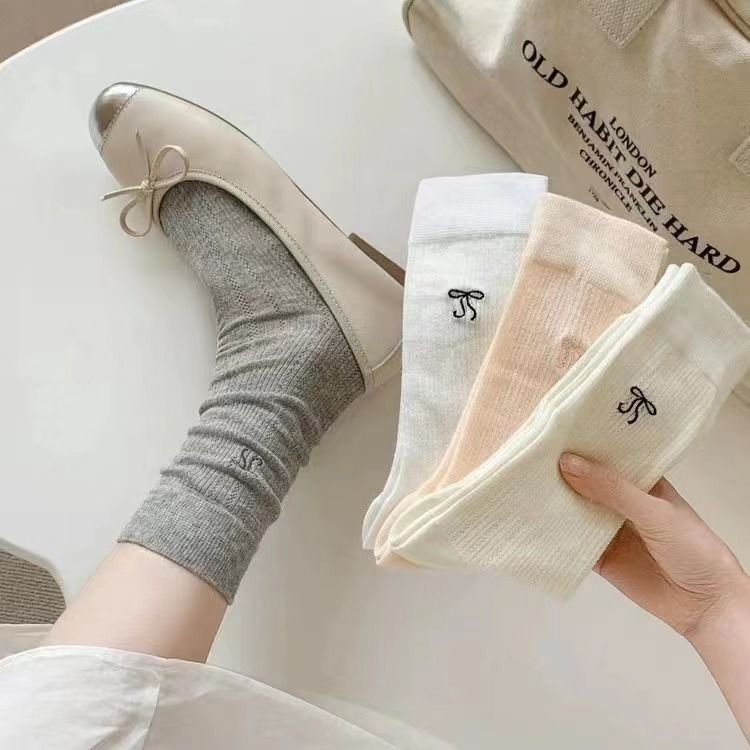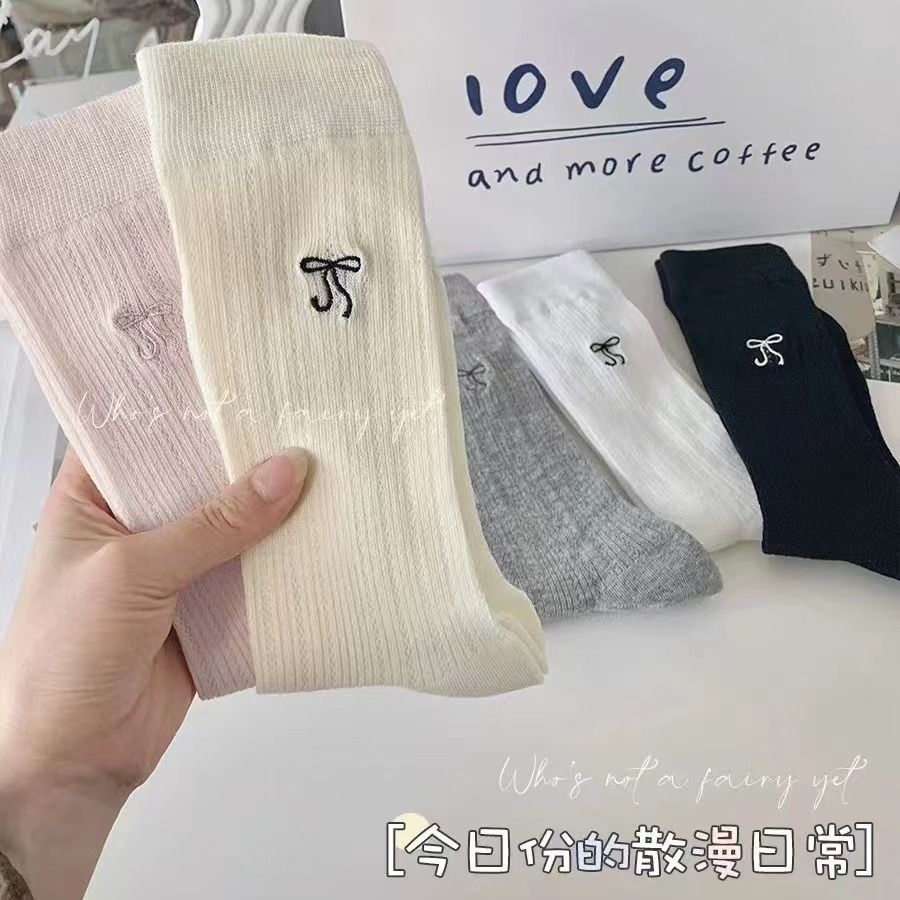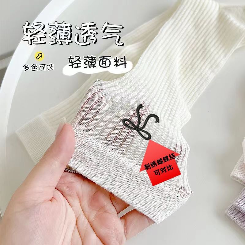 夏季薄款袜子女刺绣蝴蝶结芭蕾风中筒袜jk甜美少女网眼堆堆袜