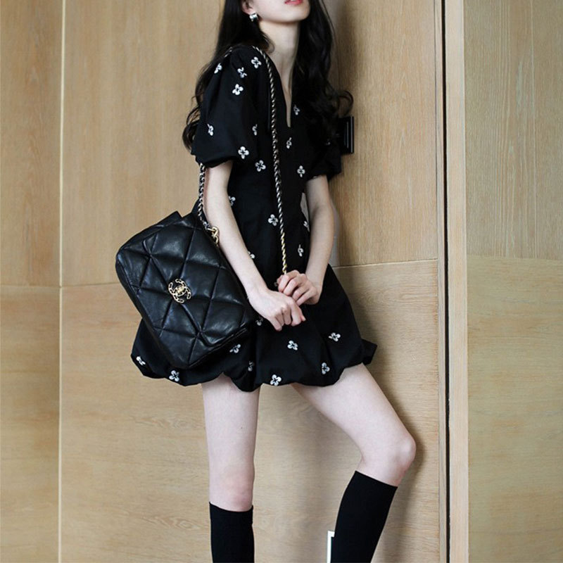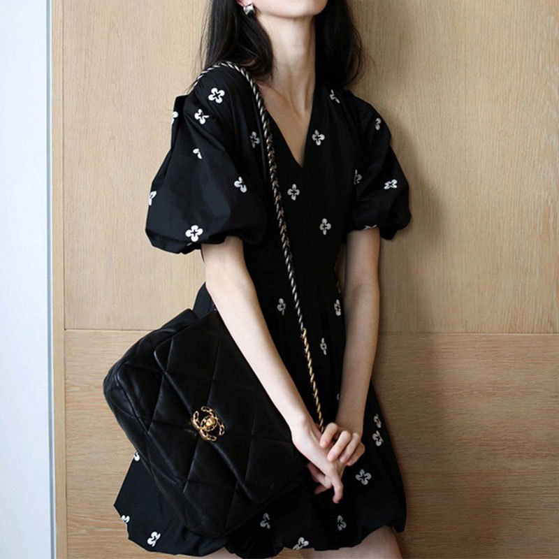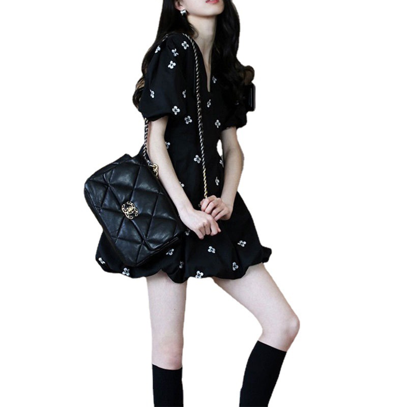 法式复古设计感花朵短袖V领连衣裙子女夏季年新款小个子减龄