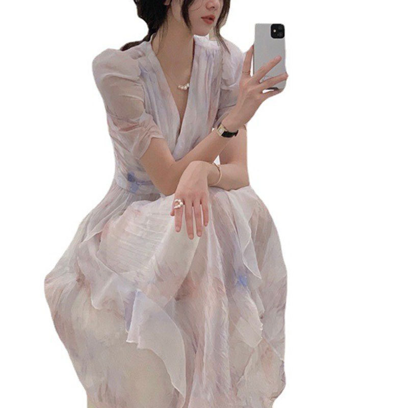 法式茶歇初恋超仙女荷叶边长裙夏季气质名媛小香风碎花连衣裙