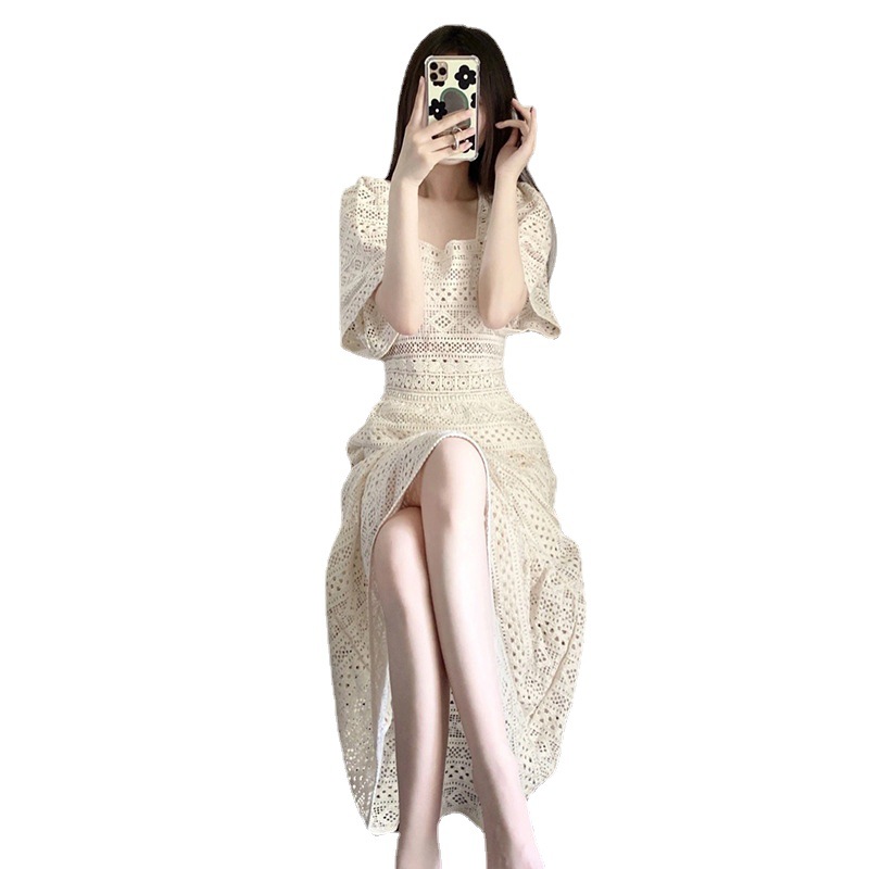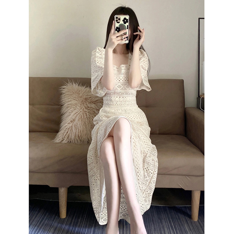 夏季新款法式温柔风小众设计长裙气质显瘦方领蕾丝连衣裙子女