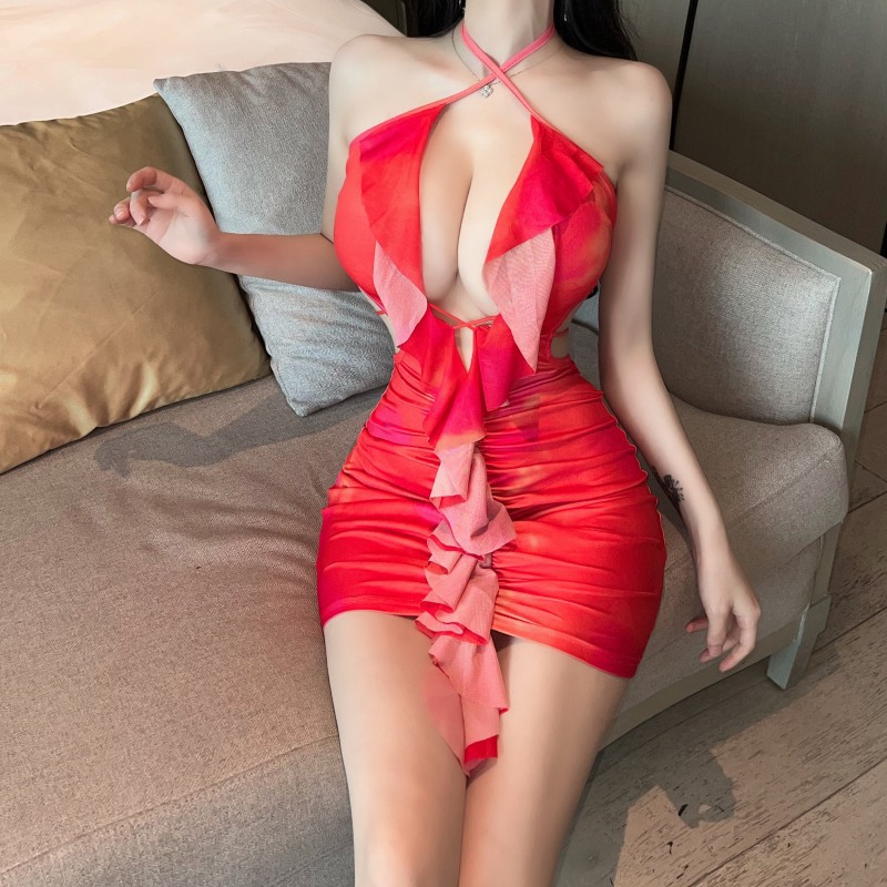 夜场工衣性感V领低胸辣妹镂空挂脖褶皱露背夜店紧身包臀连衣裙女