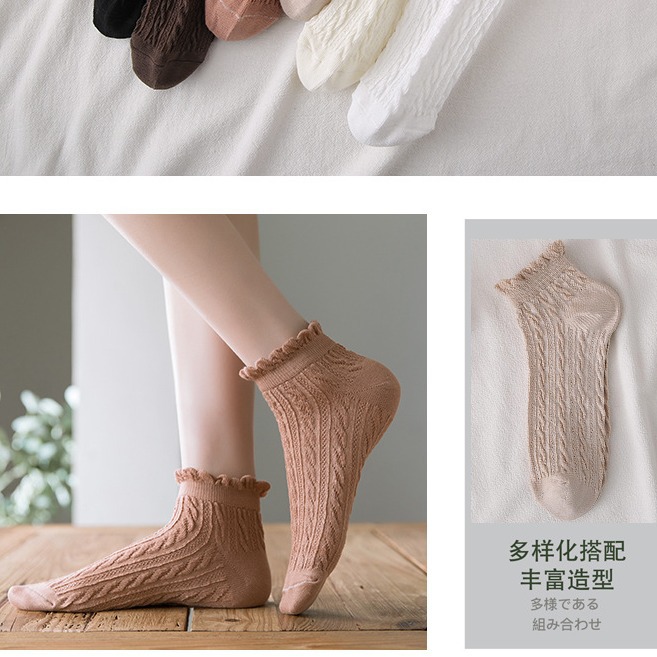 袜子女春夏木耳边船袜女日系麻花短款女士纯色棉袜现货花边女袜