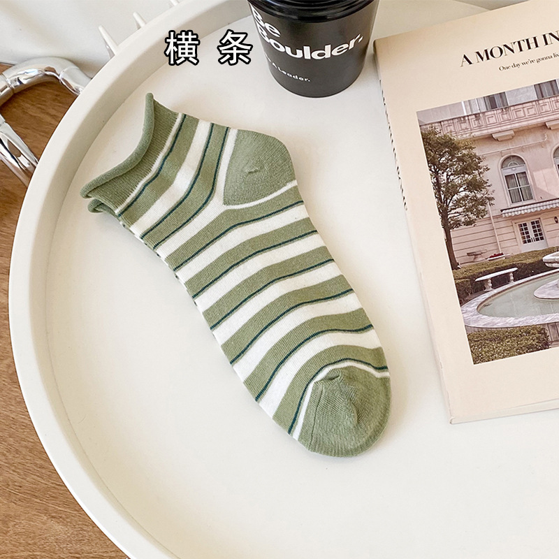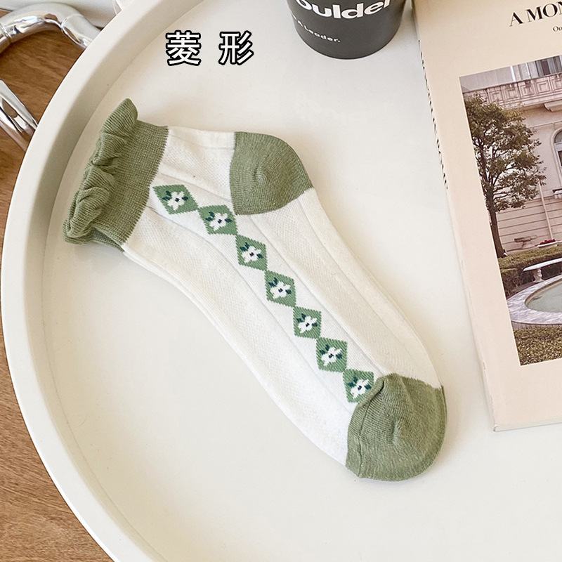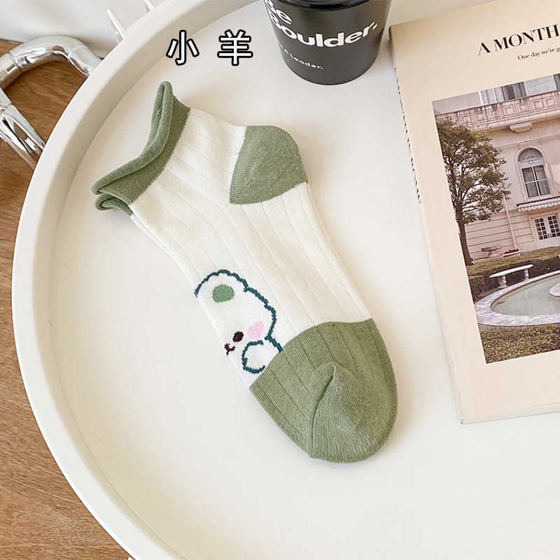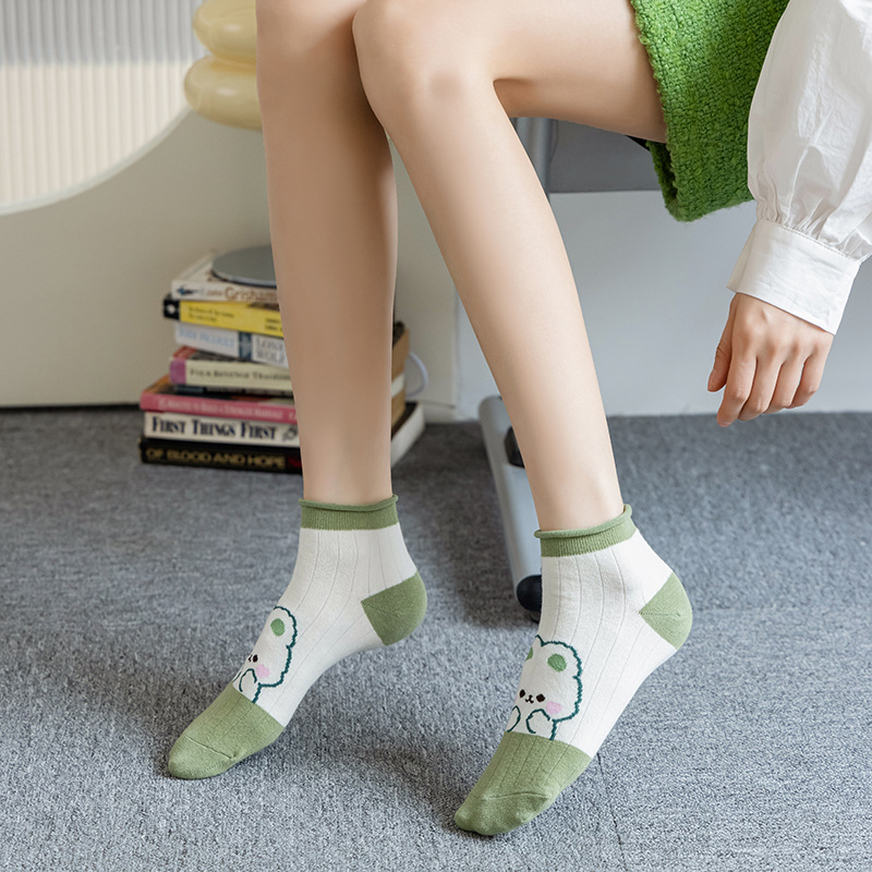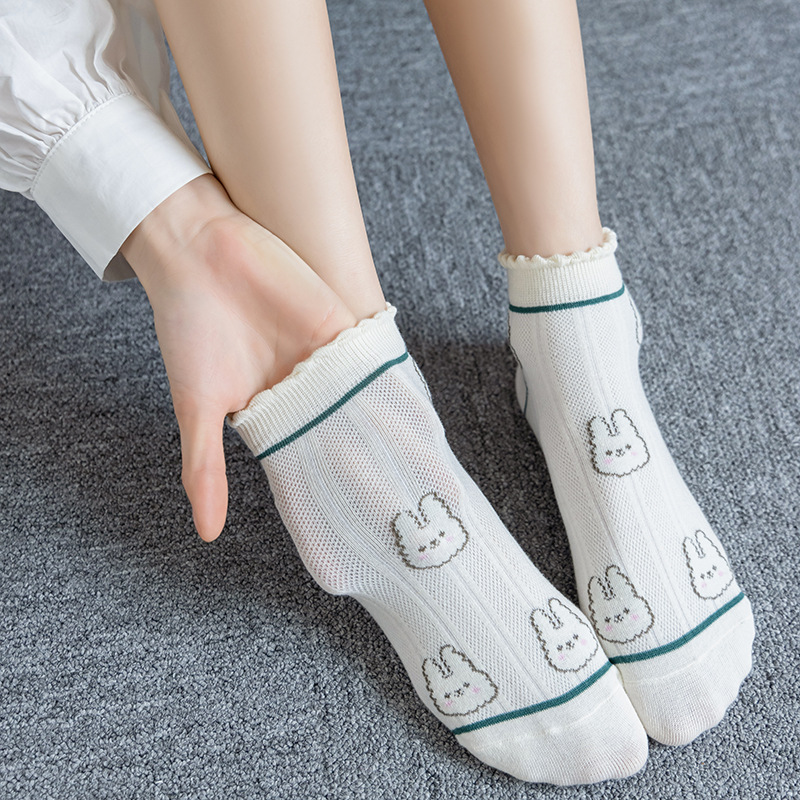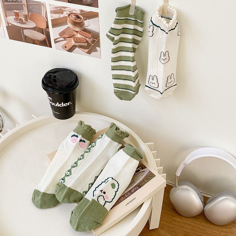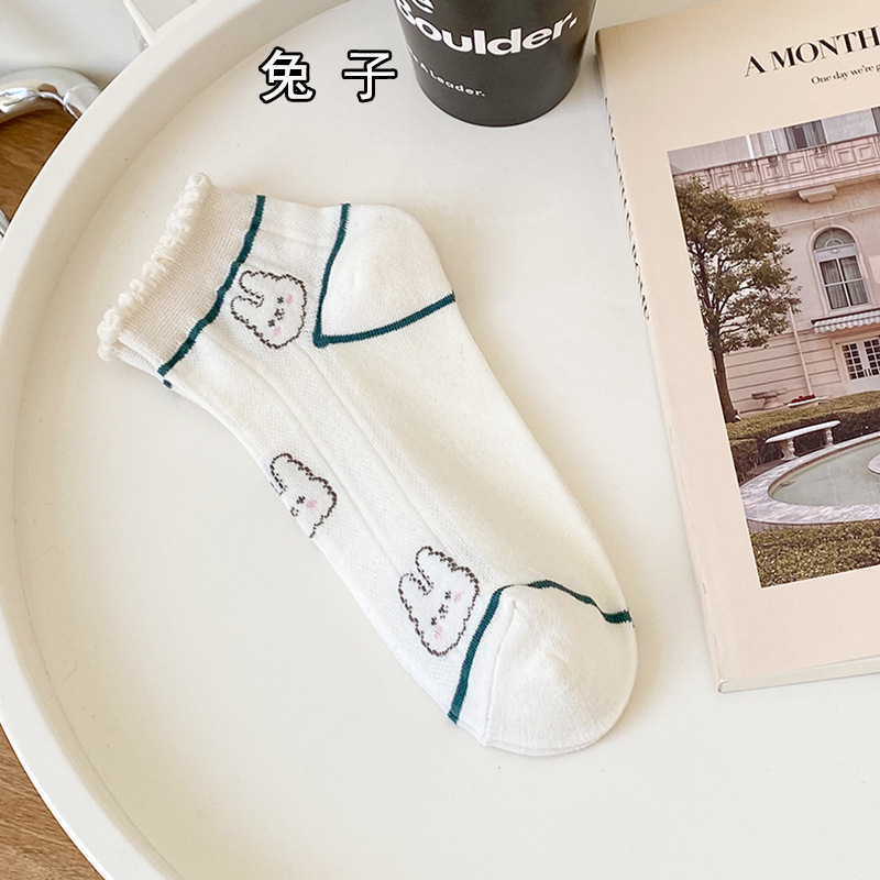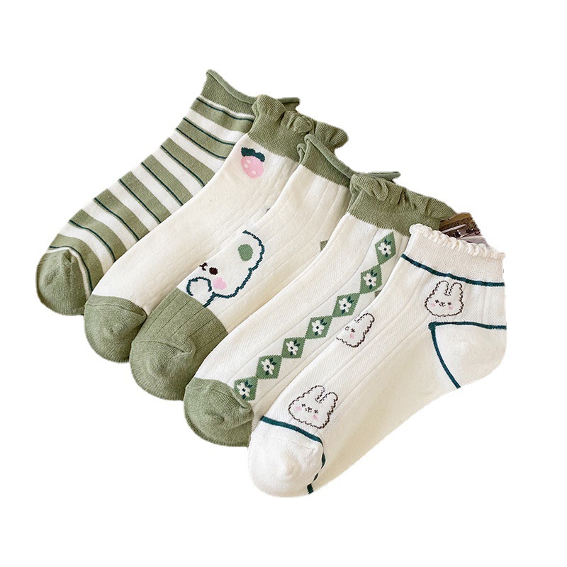 袜子女春夏小清新船袜女卡通兔子短筒女袜绿色系罗口花边短袜女