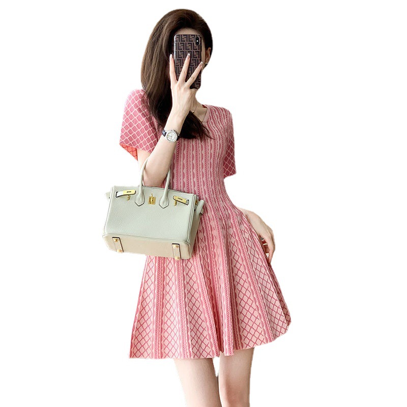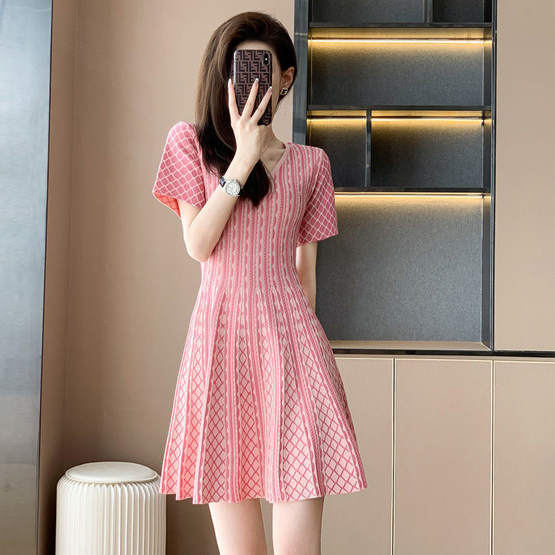 夏装新款女装法式茶歇收腰显瘦裙子小香风粉色v领针织连衣裙