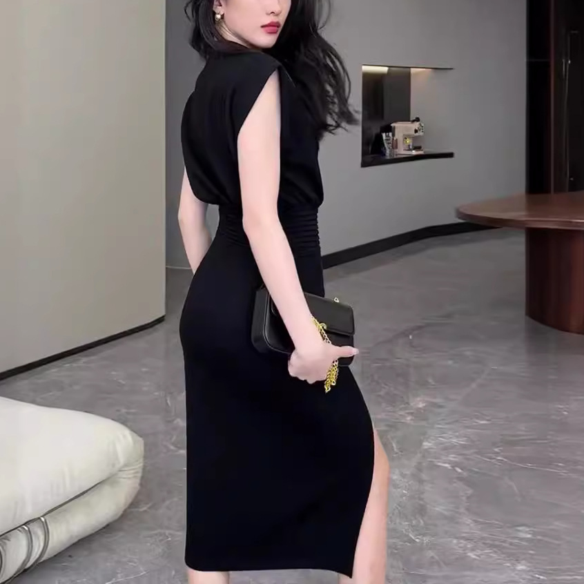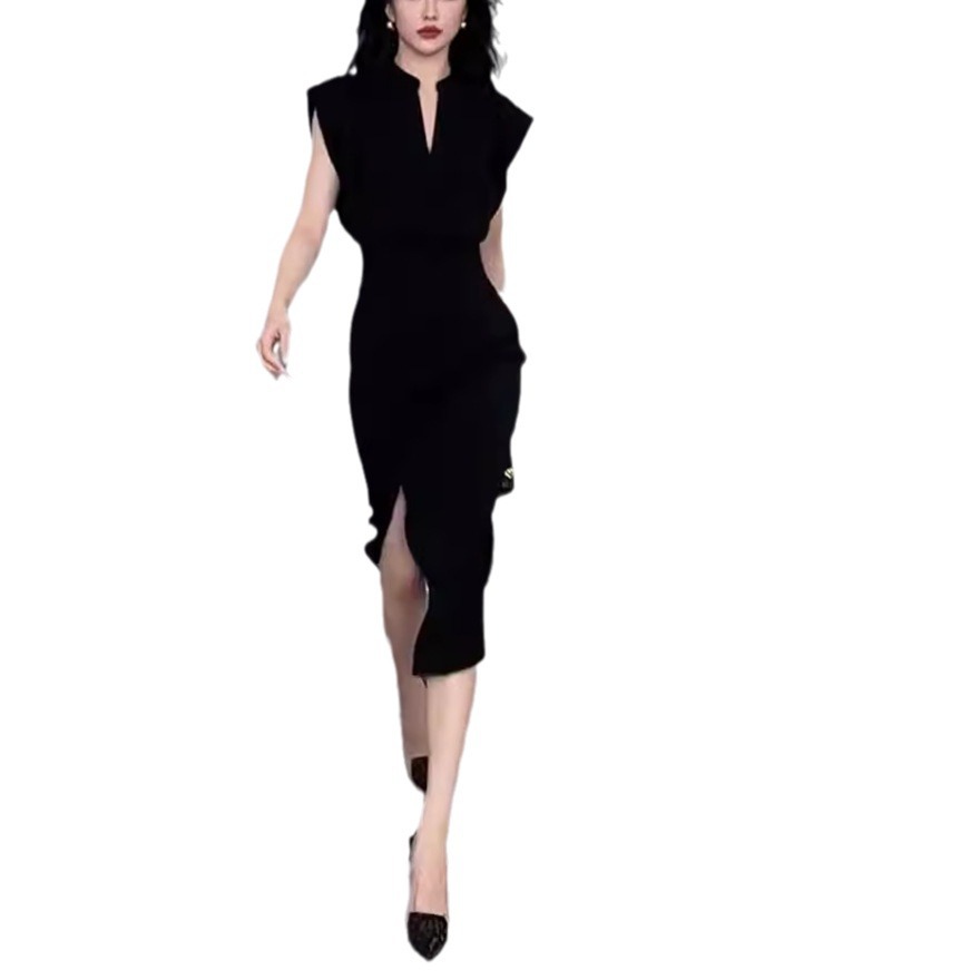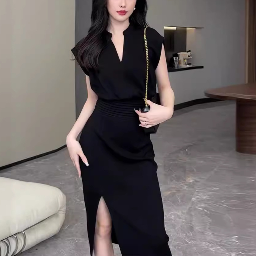 夏季名媛气质女神范赫本风裙子黑色显瘦V领飞飞袖开叉连衣裙