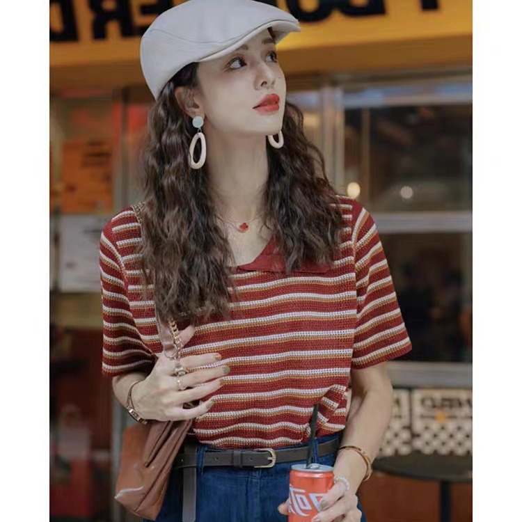 polo领上衣女小众别致独特设计高级感夏季正肩条纹短袖t恤女