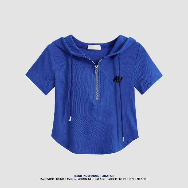 蓝色短袖连帽T恤女夏季薄款小个子修身显瘦小衫气质短款上衣ins潮