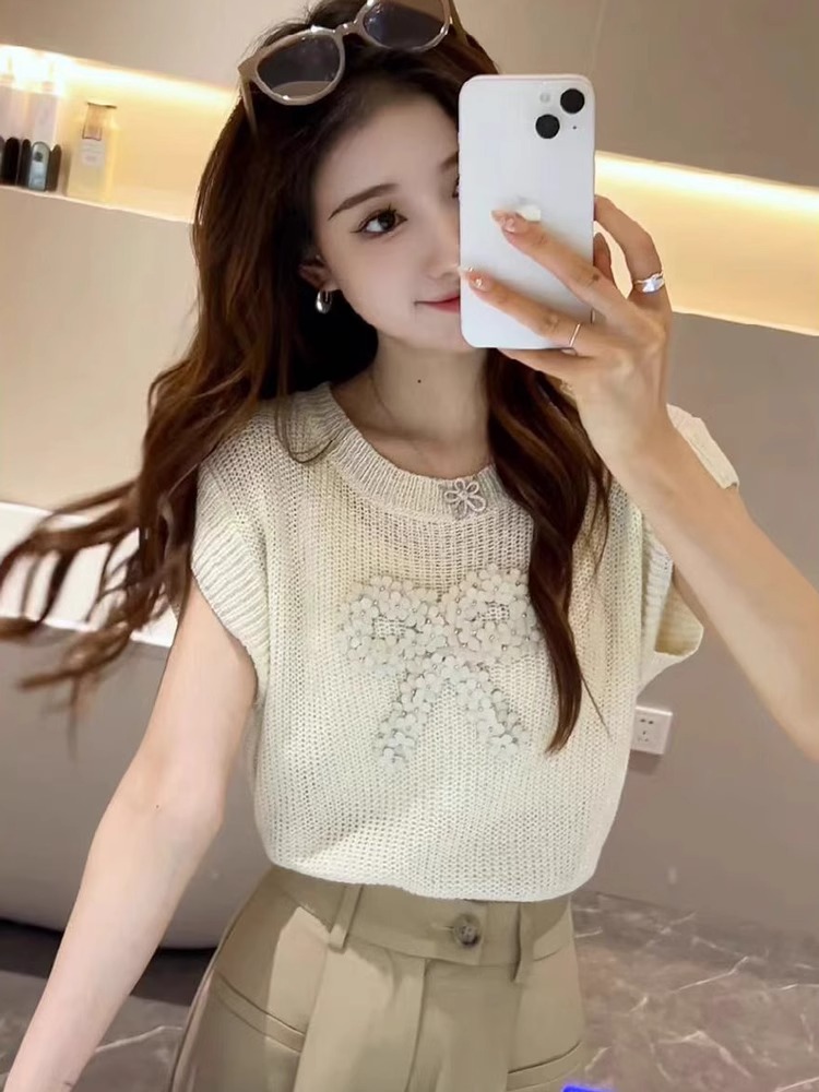 镂空薄款冰丝针织衫短袖T恤女2025新款夏季圆领蝴蝶结小飞袖上衣