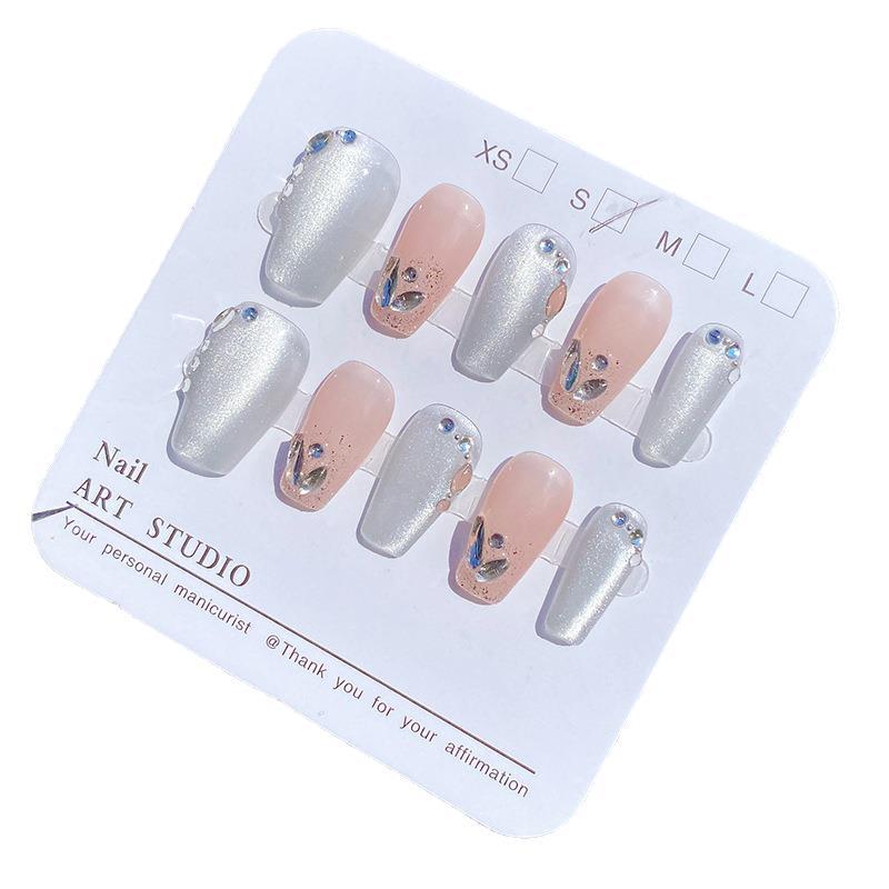 手工制作穿戴甲青提猫眼裸色清冷冰透钻美甲贴成品可拆卸