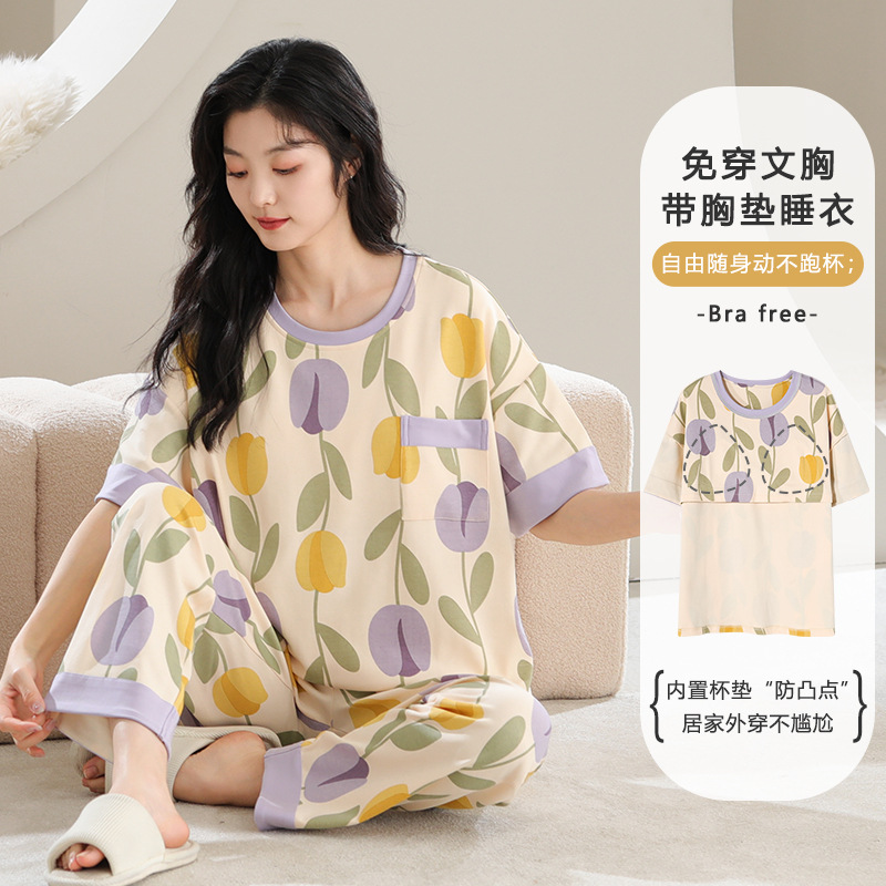 带胸垫睡衣女夏季纯棉薄款短袖长裤女士可外穿免穿文胸家居服套装