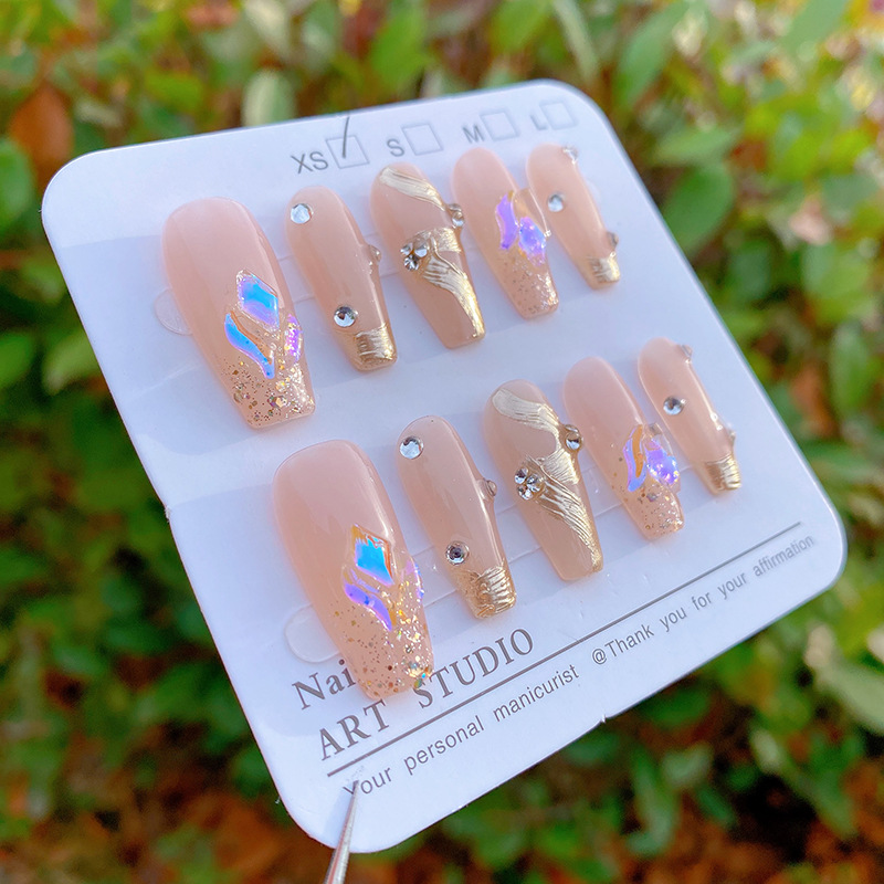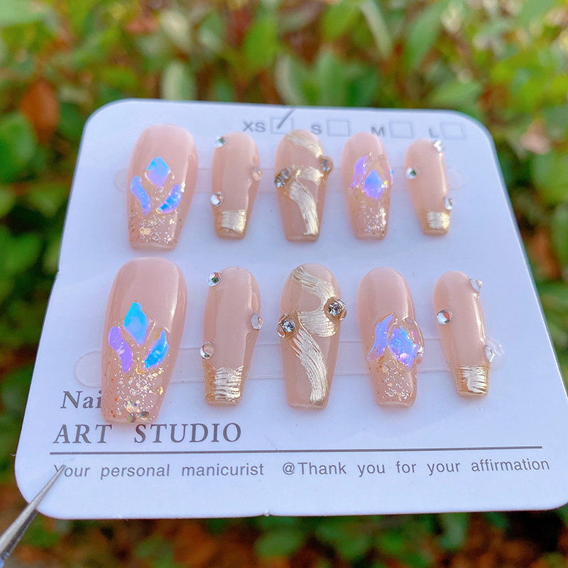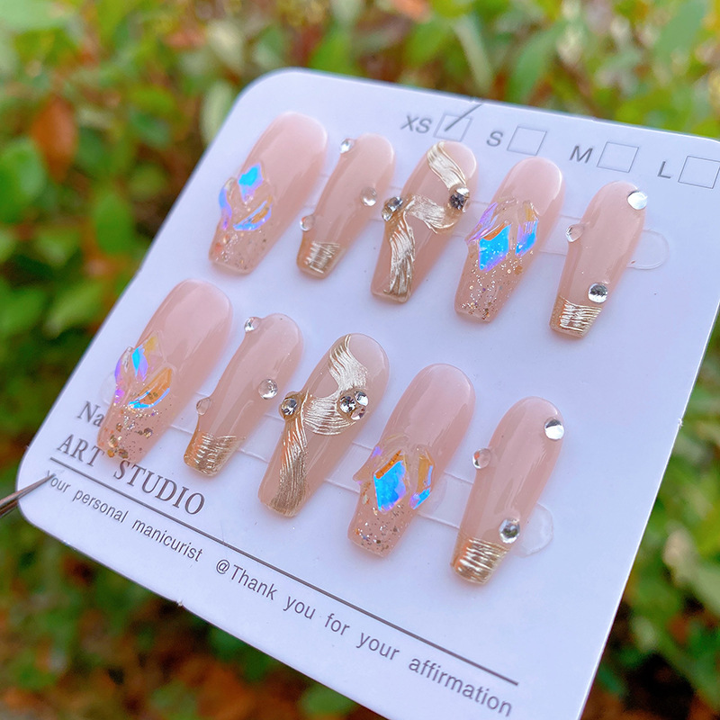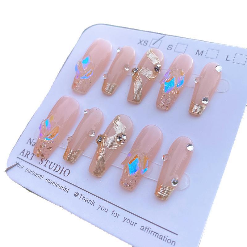 纯手工穿戴甲裸粉极光钻金色飘带可拆卸甲片