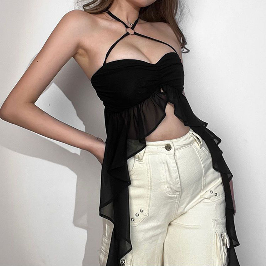 挂脖式抹胸吊带女网纱拼接设计感短款上衣性感辣妹潮