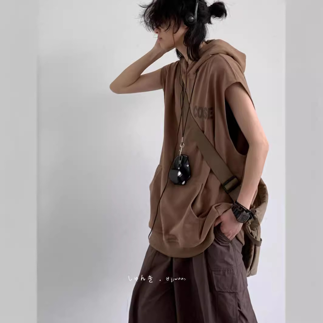 夏季美式复古连帽无袖背心男潮牌休闲宽松运动坎肩字母印花马甲男