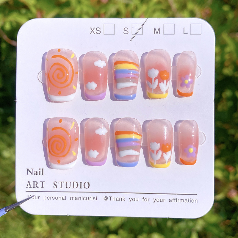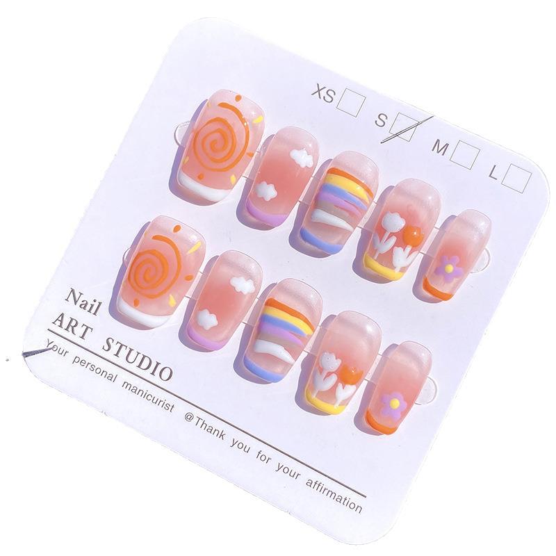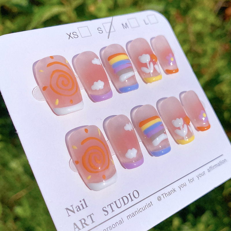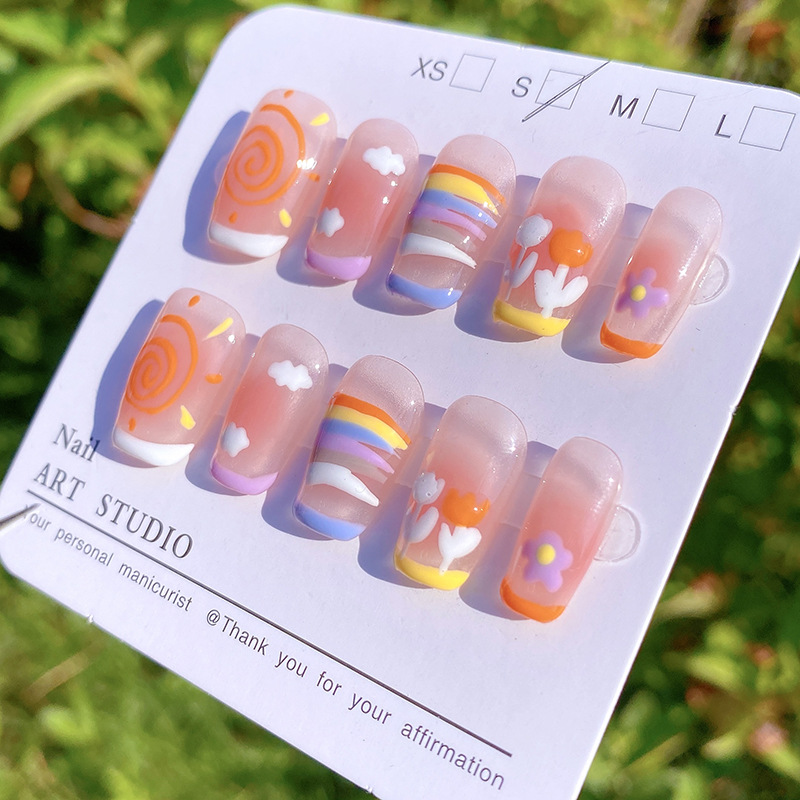 纯手工穿戴甲夏日多巴胺可爱彩虹ins风短方圆美甲可拆卸甲片