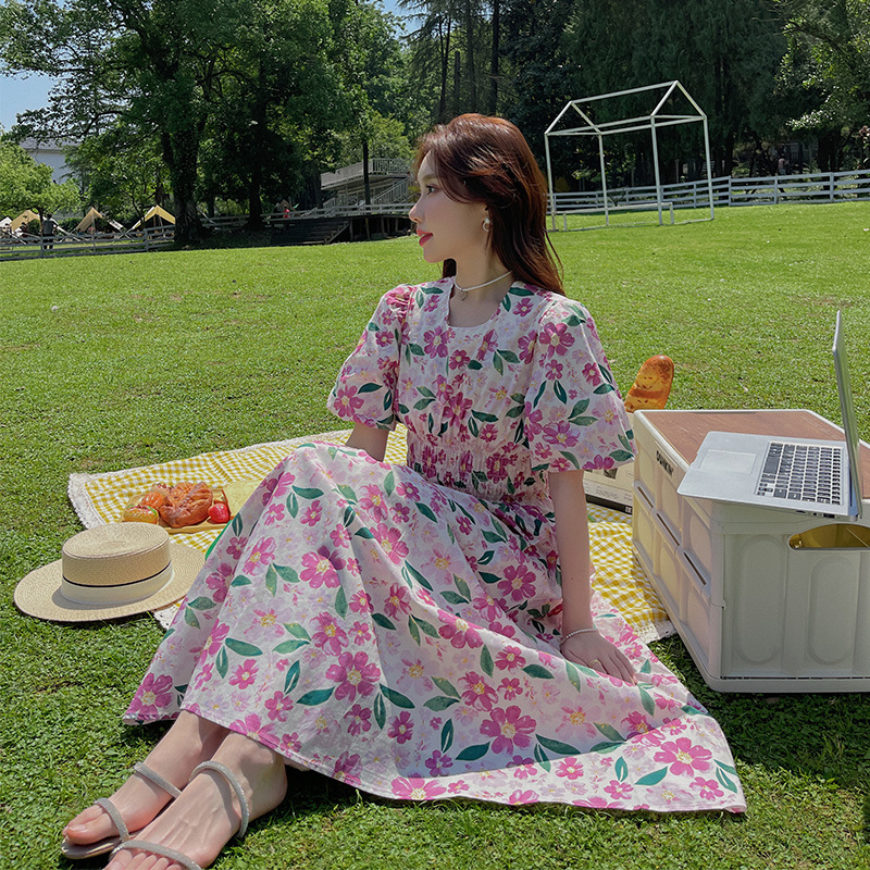 实拍大花收腰连衣裙女中长款夏季收腰显瘦气质初恋裙时尚休闲